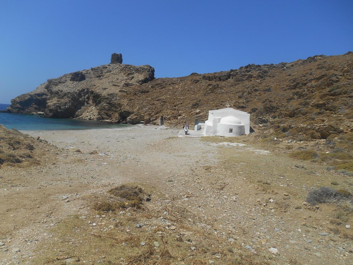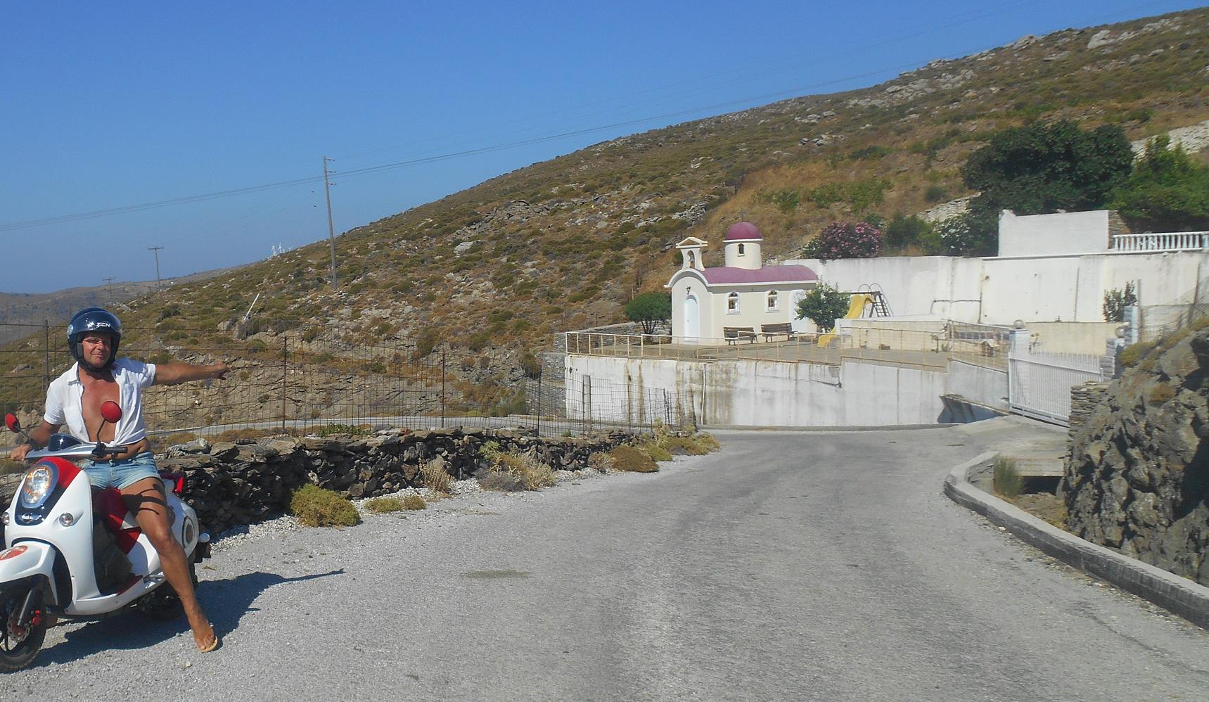 Kalivari en Palestou. Daar neem je de weg linksaf, naar Fassa (de vuurtoren) en Chartes. Na een aantal kilometers, staat er aan de rechterkant van de weg een klein kerkje met een
