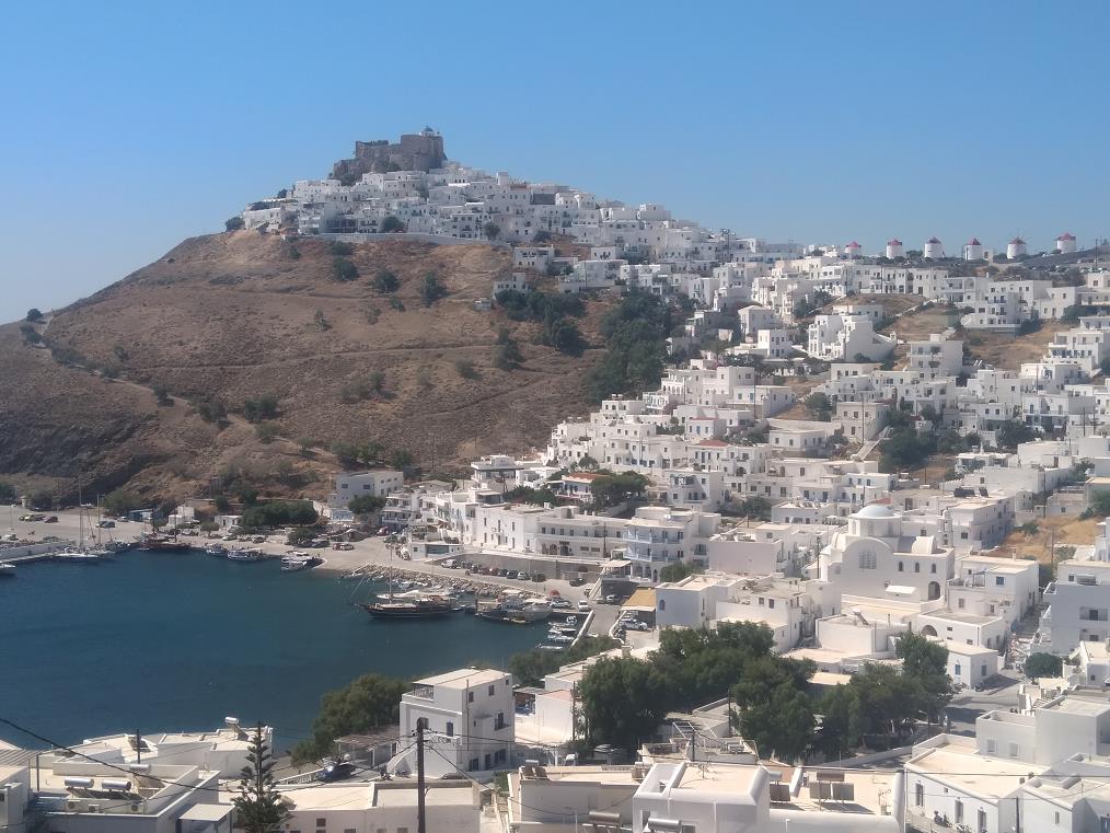 het spierwitte "chora" op de heuvelhelling ziet blinken, met een rij windmolens ernaast, zul je denken dat je nog steeds in