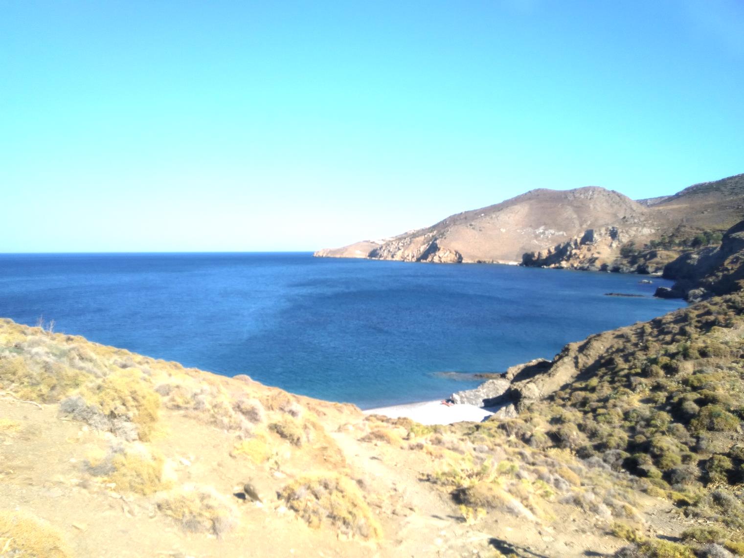 Een eindje verder ligt Tzanaki. Je kunt op twee manieren op het strand komen, beide manieren voeren over onverharde wandelpaden, die deels over de rotsen lopen.