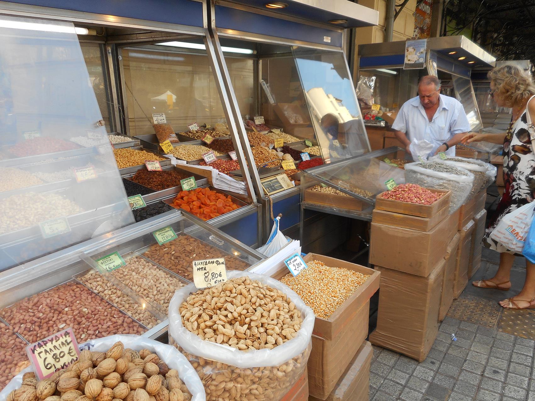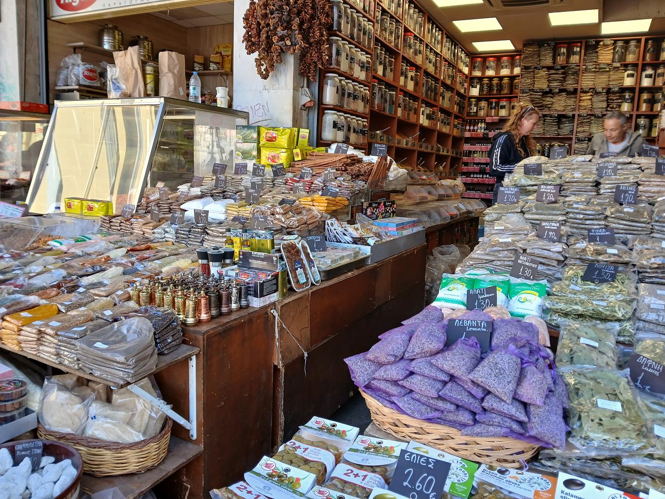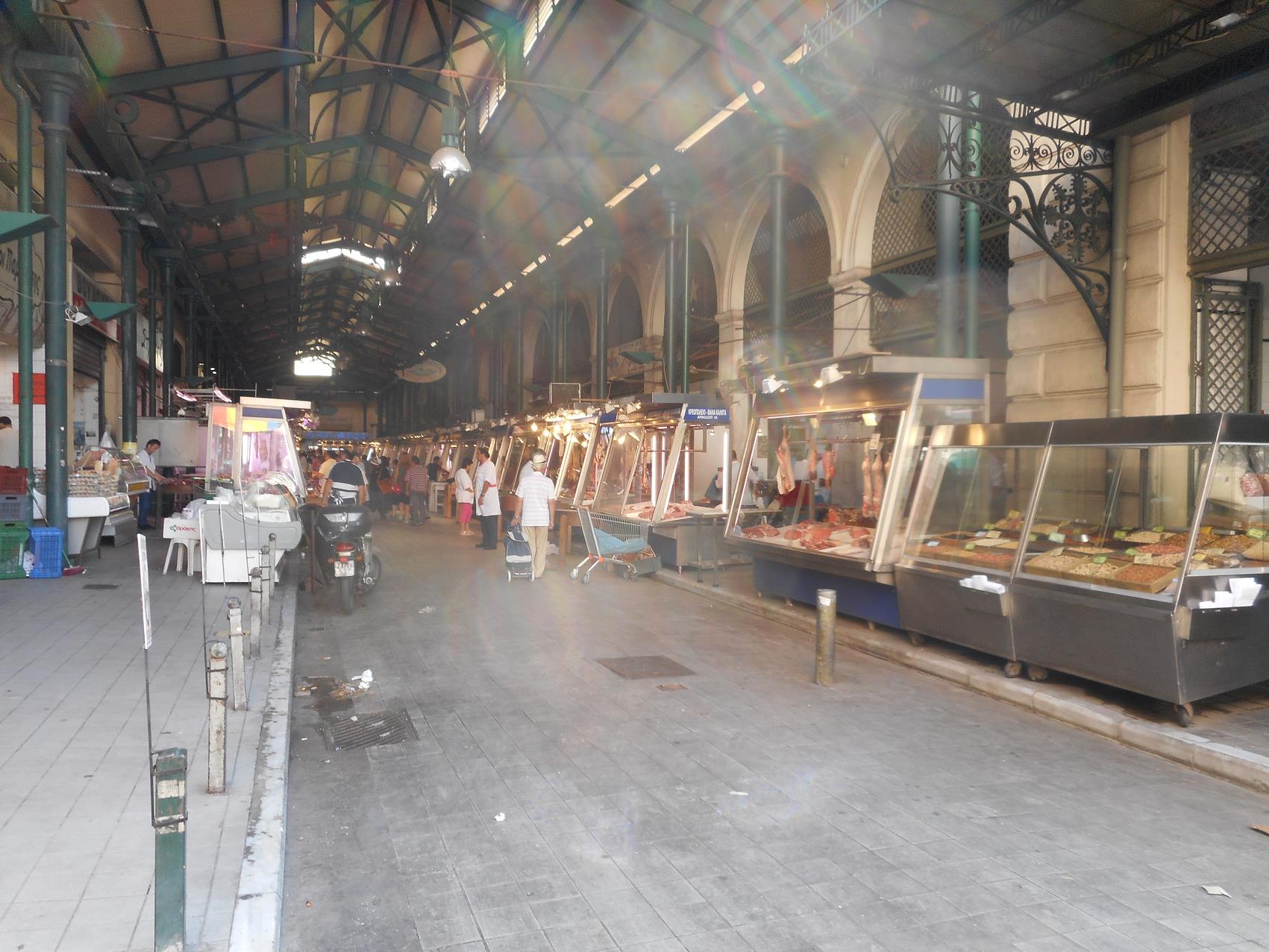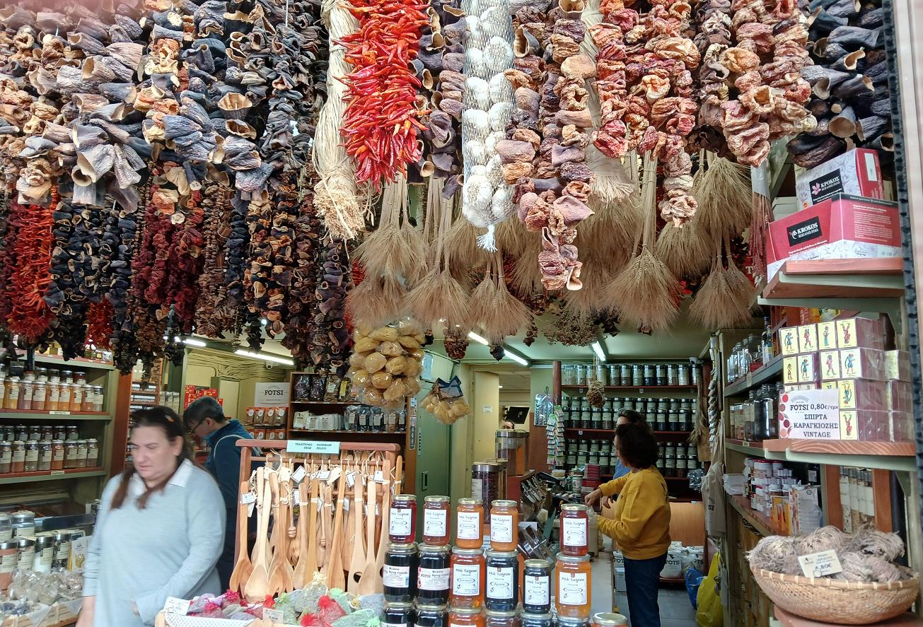 Aan de ene kant van de Athinas, in het overdekte deel vind je voormamelijk vlees, vis en kruiden.