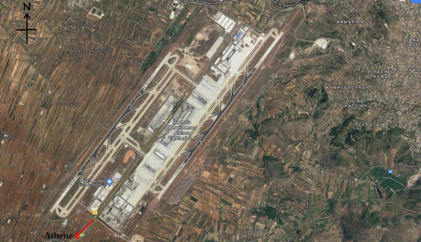 Zoals op het satellietkaartje van Google (links) is te zien, ligt het gehele complex van het vliegveld ongeveer diagonaal,