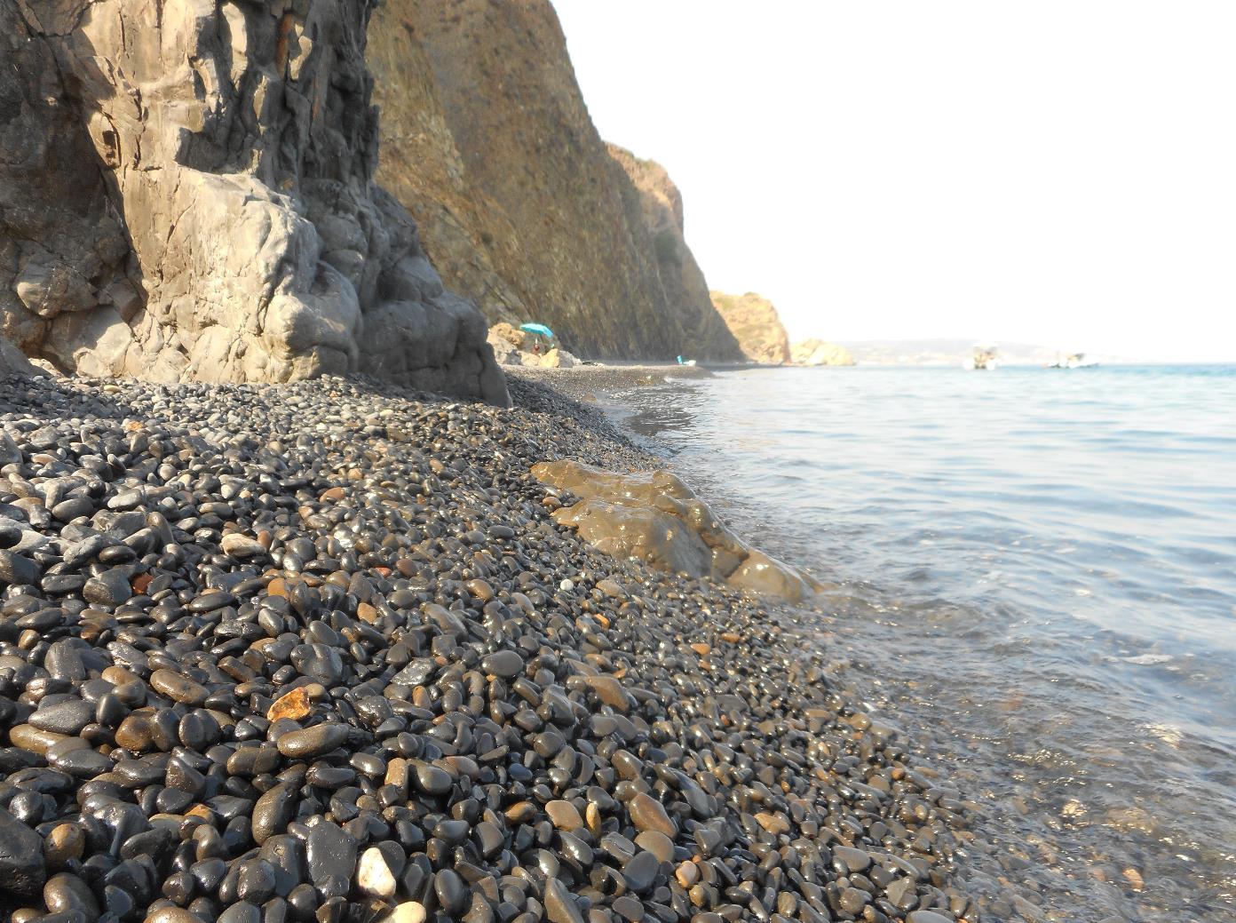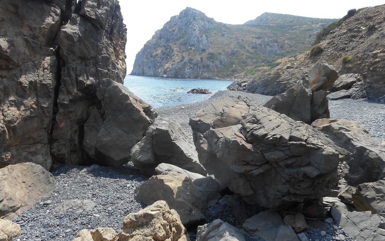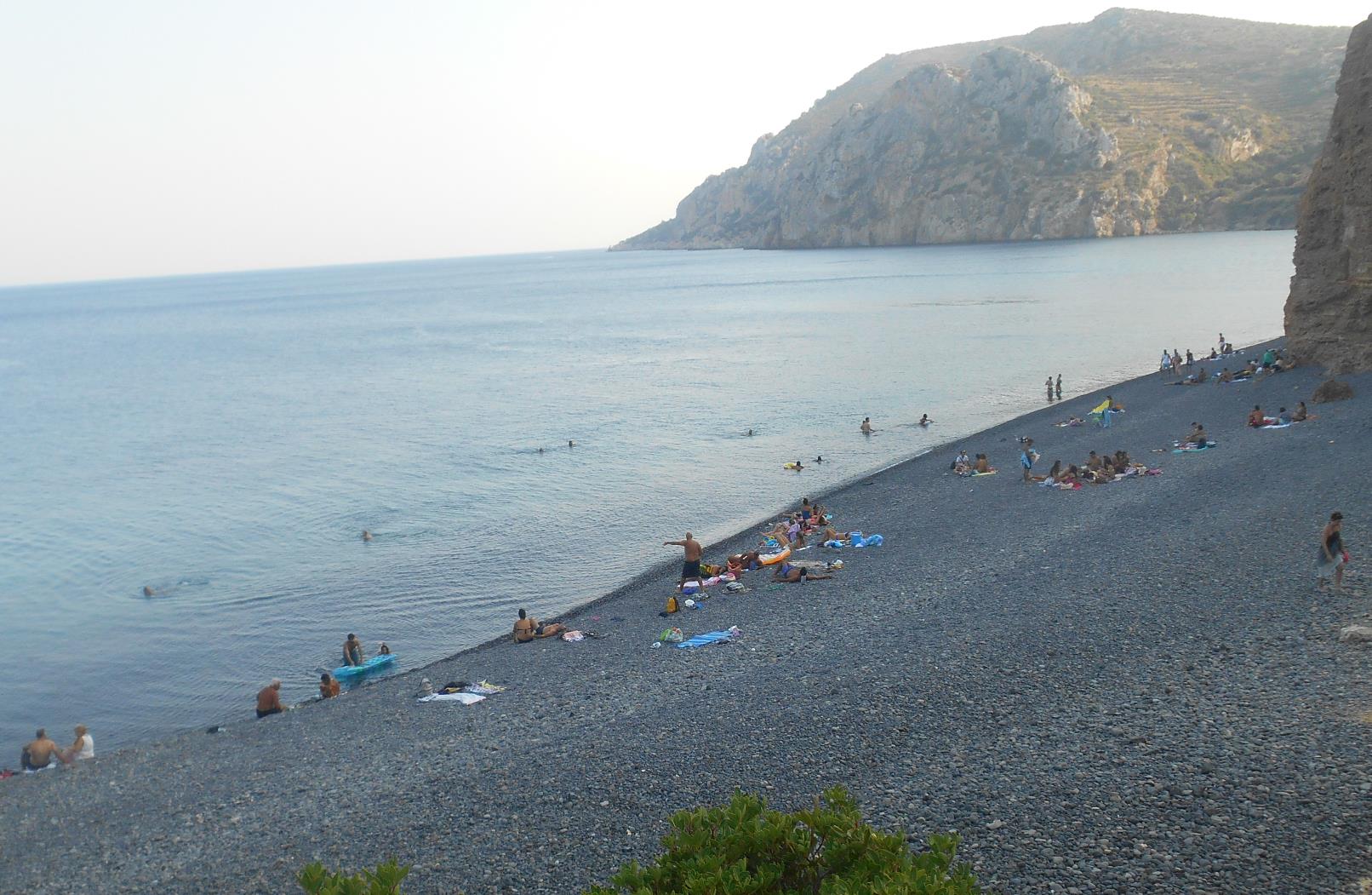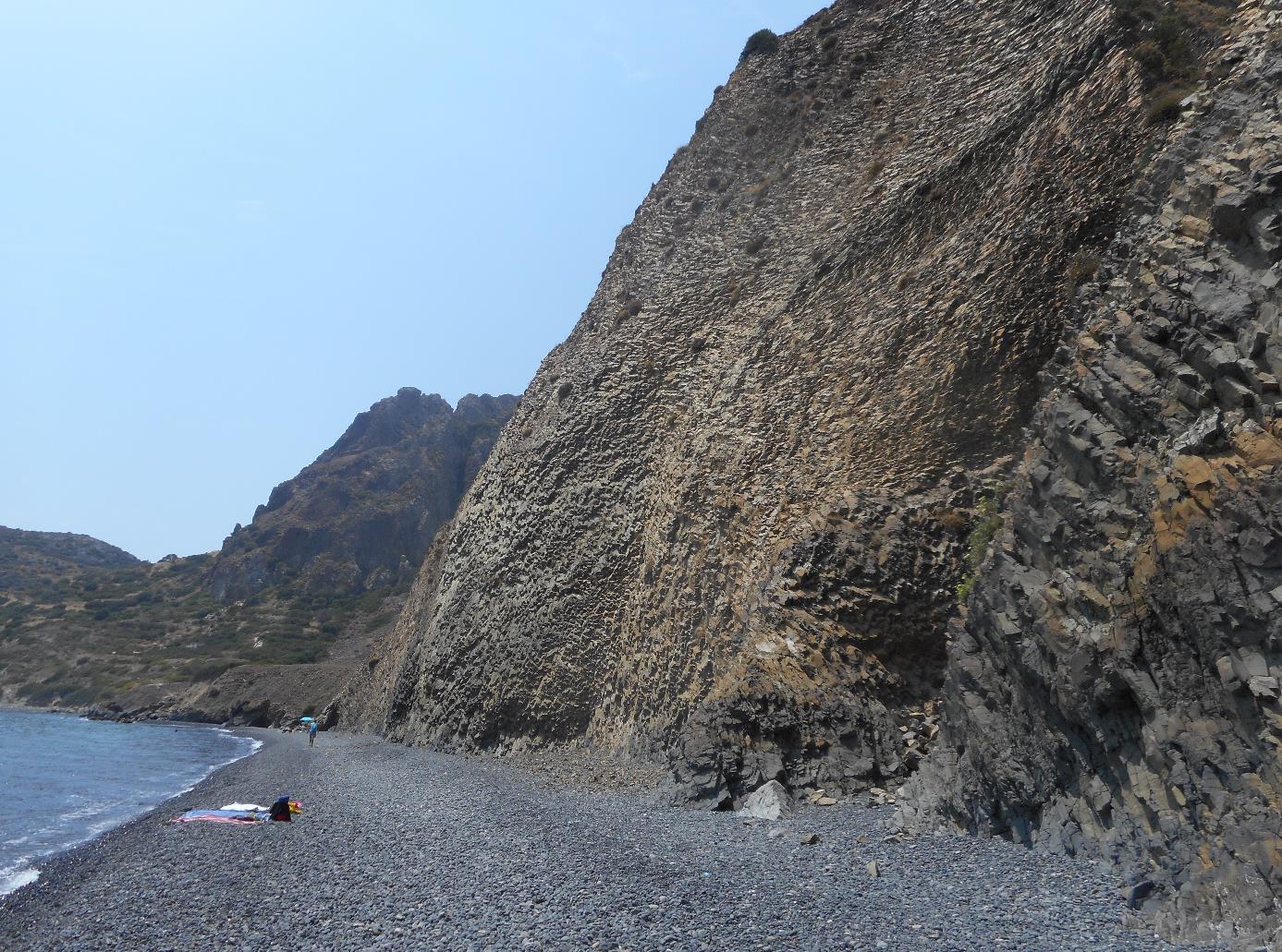 Het zwarte lavastrand, het enige trouwens op Chios, bestaat uit meerdere delen, dus is er heel veel plaats.