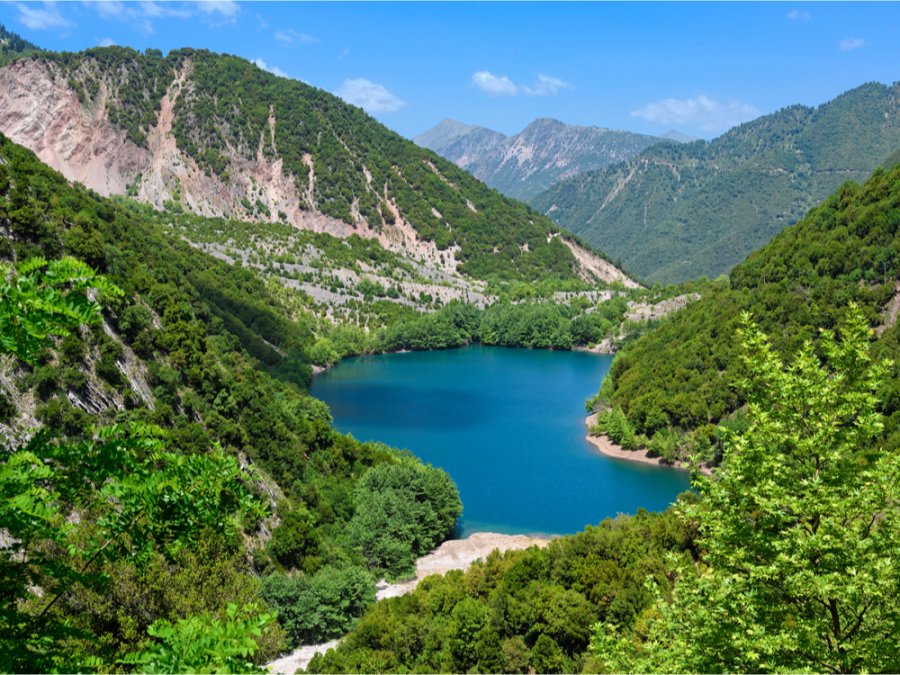 gelegen aan het meer. Het gebied is erg bergachtig. Het Pindos-gebergte ligt ten noorden van de hoofdstad.