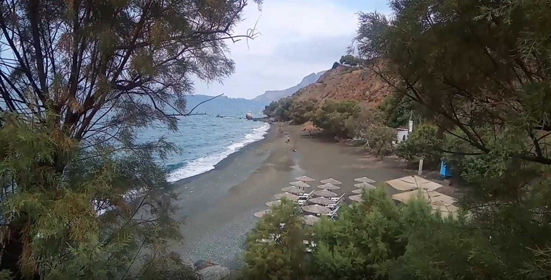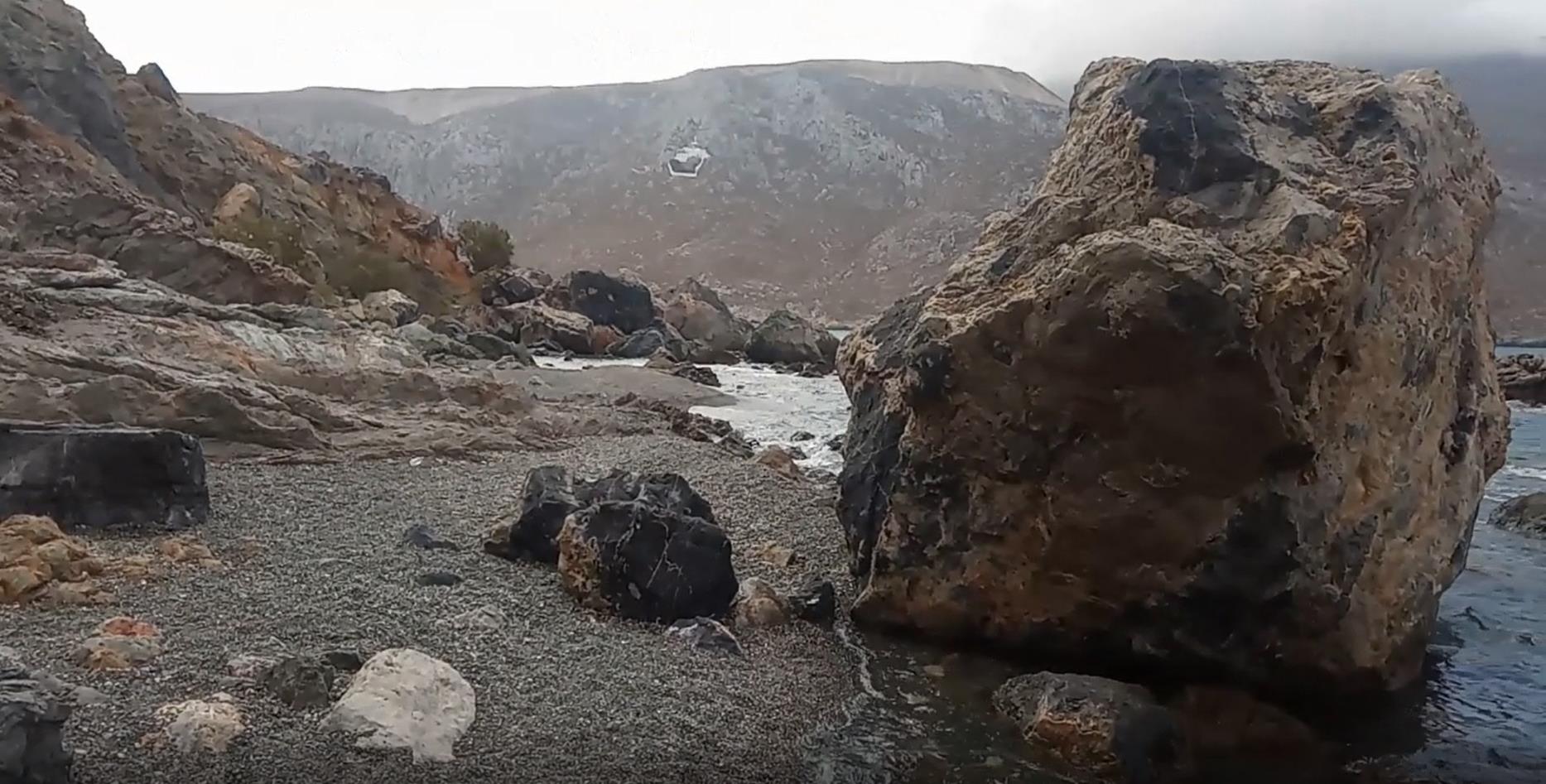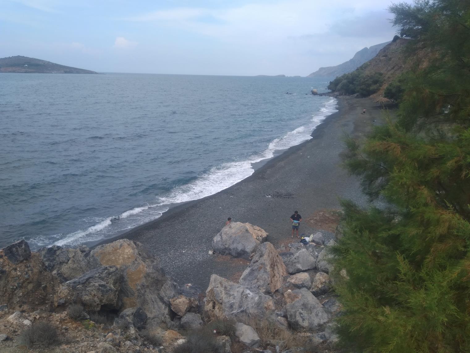 van Kalymnos. Het bestaat uit grote en kleine zwarte kiezels en loopt snel af in zee. Wanneer er veel wind is