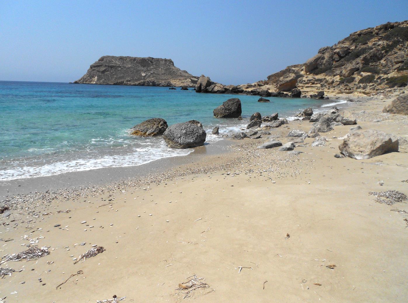 Tegenover de noordkant van het strand ligt het eilandje Sokastro. Vanaf het strand lijkt het een schiereiland,