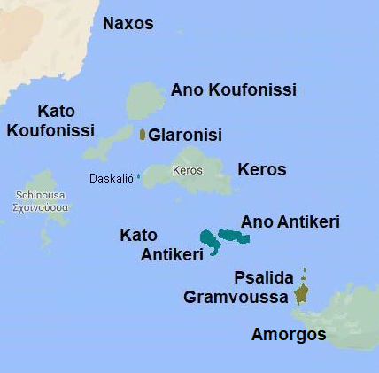 Het eilandje Daskalió zat in de oude tijd vast aan Keros en maakte dus deel uit van Keros. Keros was in die tijd een erg belangrijk eiland. Op Daskalió zijn de restanten gevonden van een oude stad en daar vond men de gebroken beeldjes. Keros had niet alleen een geografisch centrale plaats in de Cycladen, maar was daarnaast, zoals gezegd, ook een veel bezochte plaats van pelgrims. Maar ook zijn er smeltputten gevonden op Daskalió, waaruit blijkt dat er koper en zilver werd gesmolten en bewerkt op het eiland. Het is aannemelijk dat er hier sprake is geweest van een zeer oude beschaving met vergevorderde ontwikkelingen. Van de vele gevonden beeldjes zijn er helaas meerdere verloren gegaan, maar gelukkig ook bewaard gebleven. Eén ervan, de harpspeler, is te bekijken in het Nationaal Archeologisch Museum in Athene. Ten zuiden van Keros liggen nog meerdere kleine eilandjes: Agios Andreas, Lazaros, Tsouloufi, Megali Plaka, Plaki en Voulyari. En verder naar het zuiden: Kato Antikeri en Ano Antikeri. KAARTJE KLEINE CYCLADEN |