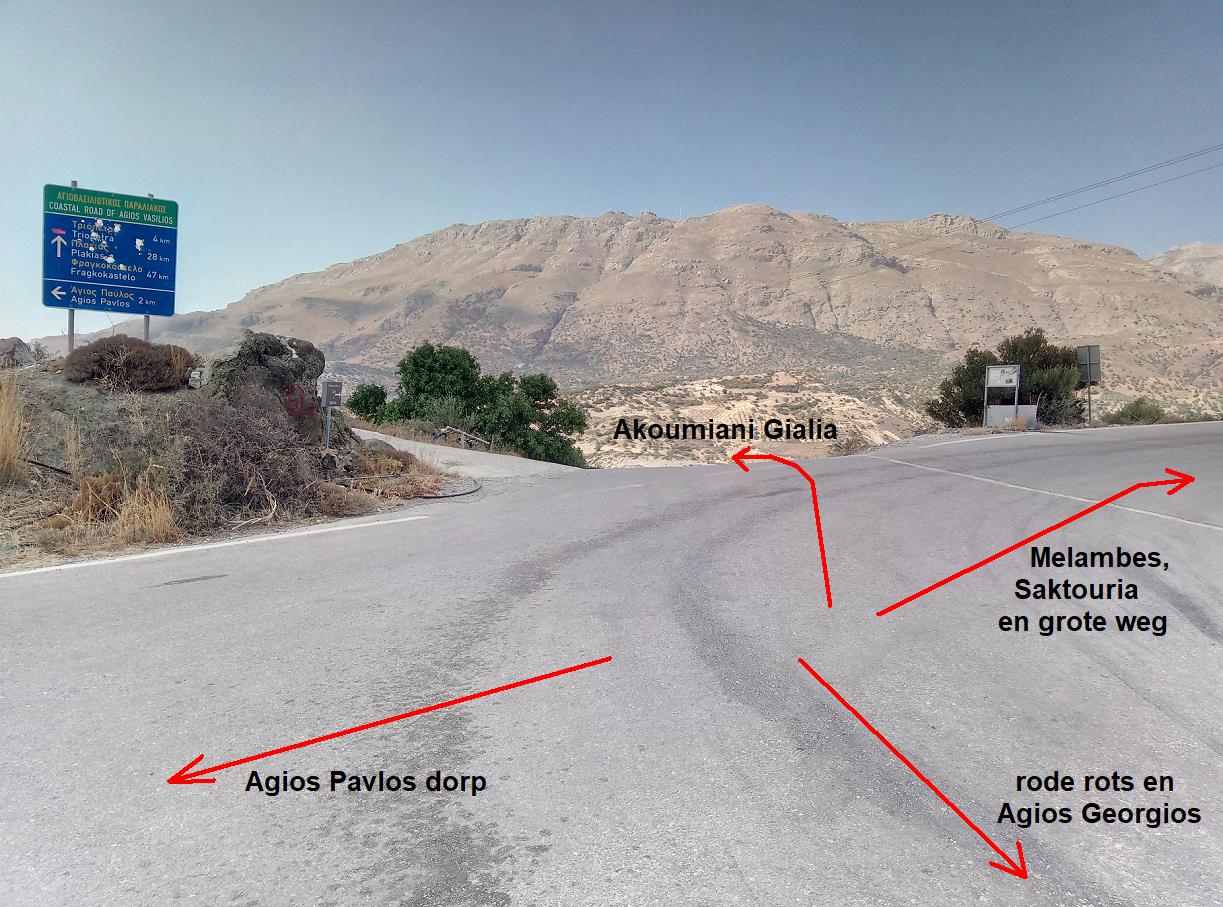 Op de daarna volgende T-splitsing sla je dan linksaf naar Akoumiani Gialia en Keramiani Gialia. (zie de foto van het bordje)