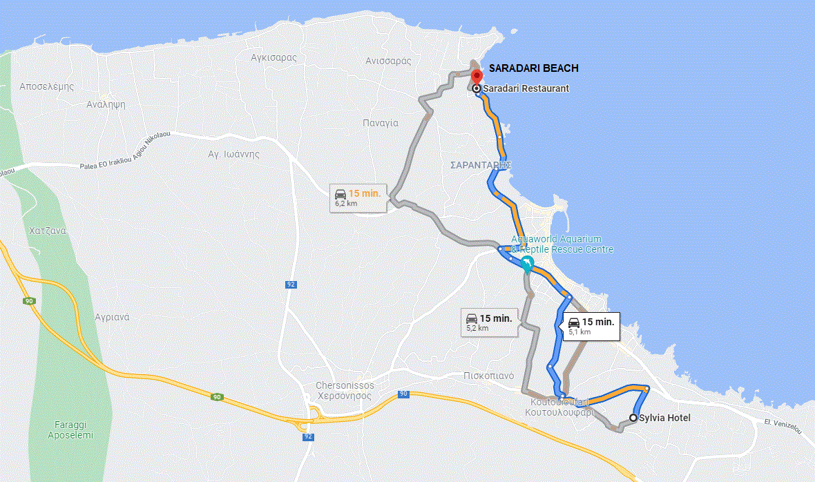 de weg langs het Medisch Centrum, op de eerstvolgende kruising ga je linksaf en rij je voorbij het Creta Maris Hotel.