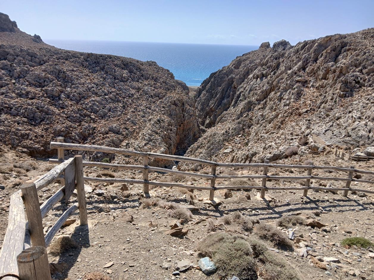 paadje met een houten leuning naar beneden, de kloof in. Verkeerd lopen kan niet. Je kunt maar één kant op.