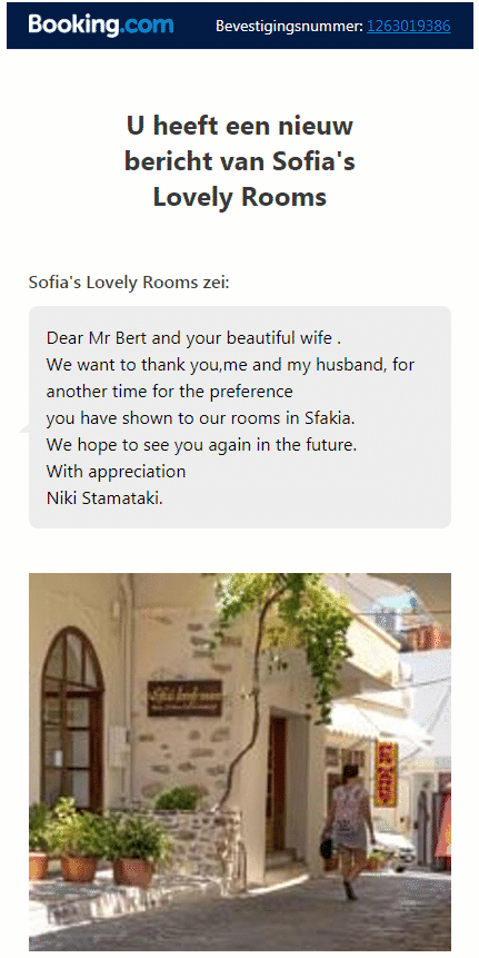 stuurden we een mail naar de eigenaars: sfakiasofiarooms@gmail.com om ze te bedanken voor hun vrijgevigheid en de fijne vakantie de we hadden gehad!