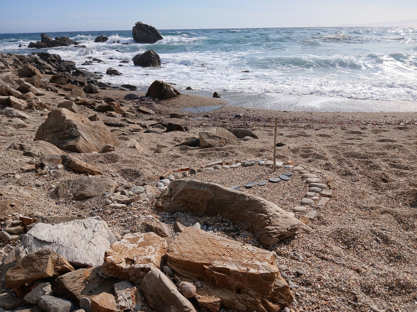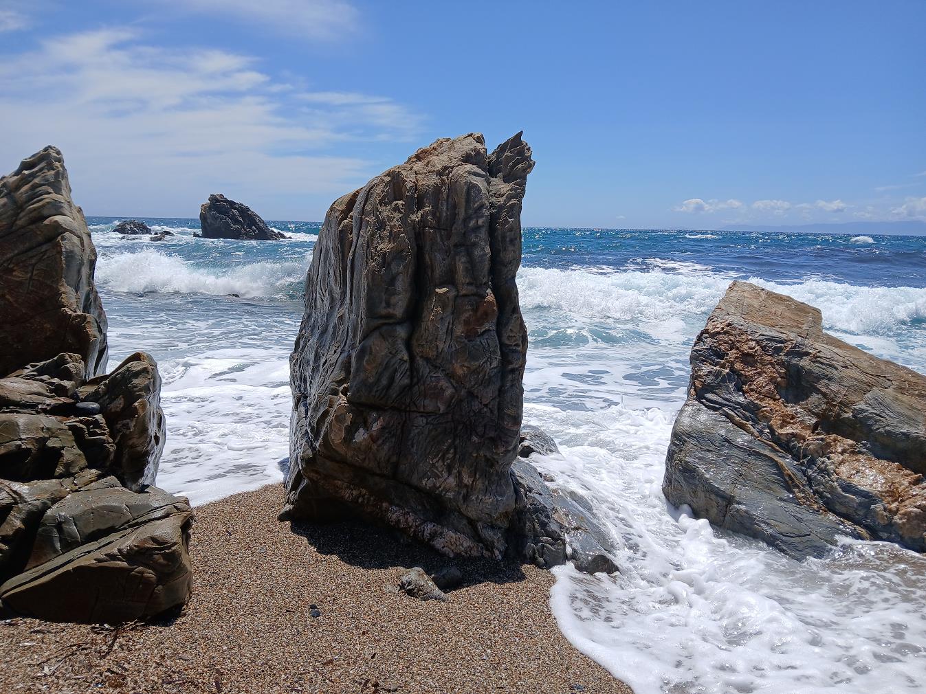 Omdat het strandje hier ook geen naam heeft, zoals zoveel kleine strandjes, bedachten we zelf de naam; het strand van de drie monsters. Er staan vlak bij het