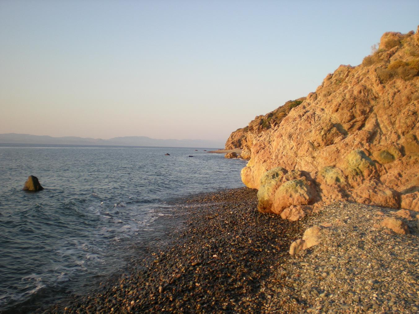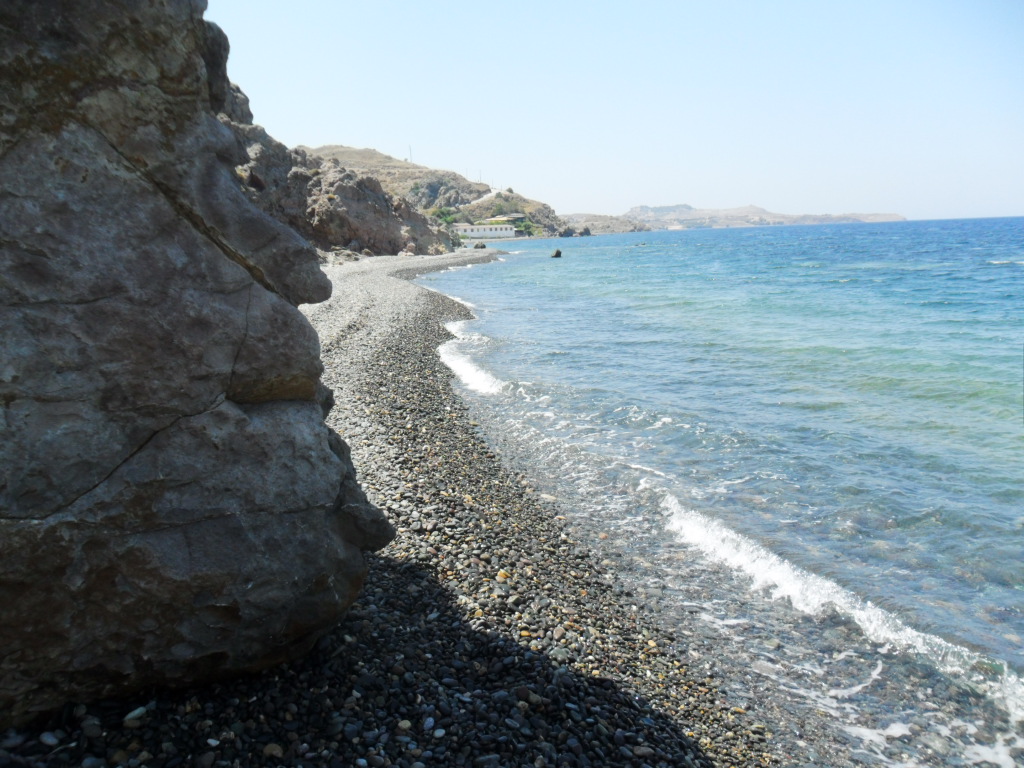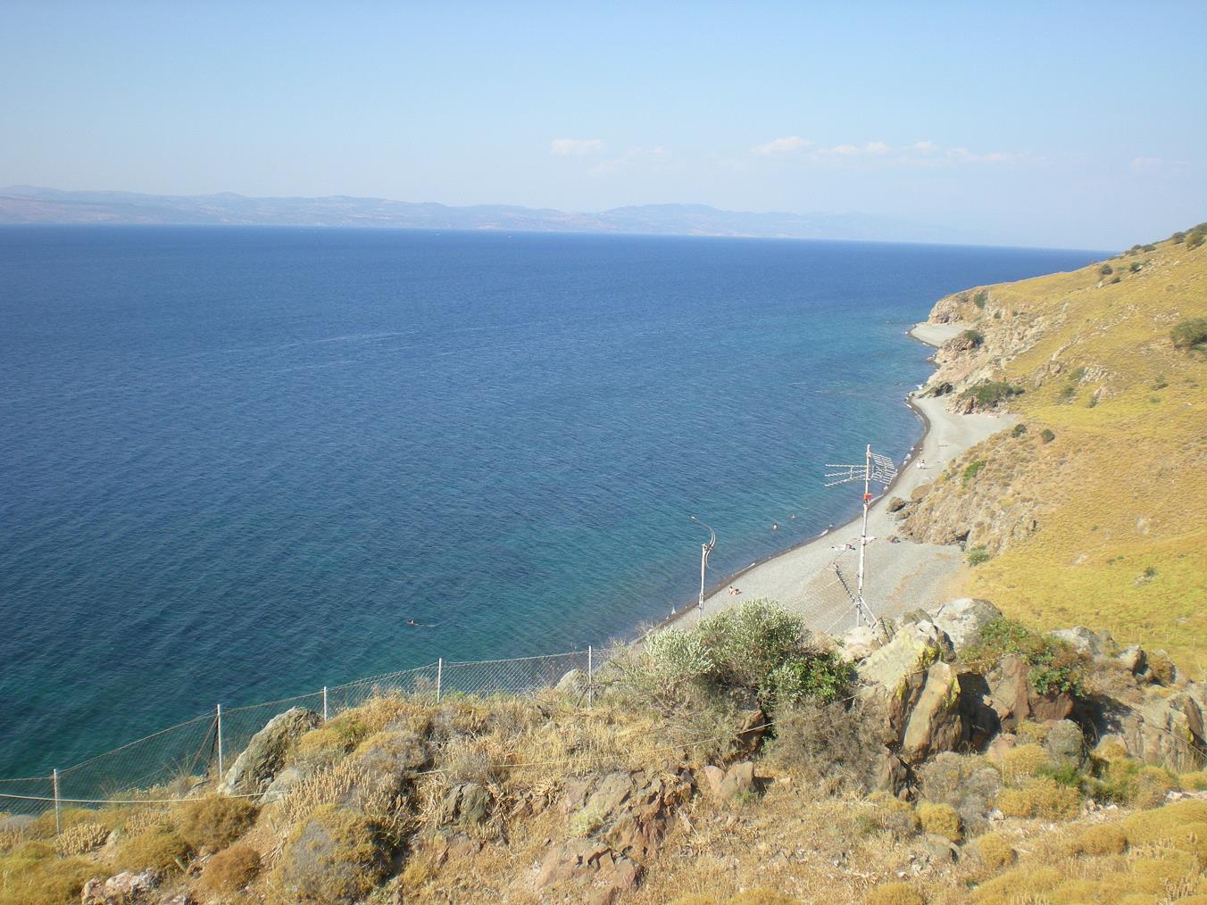 de berg en slaat dan vlak voor Molyvos rechtsaf naar Eftalou. Het eerste stuk van Eftalou is een lang smal strand, met de weg