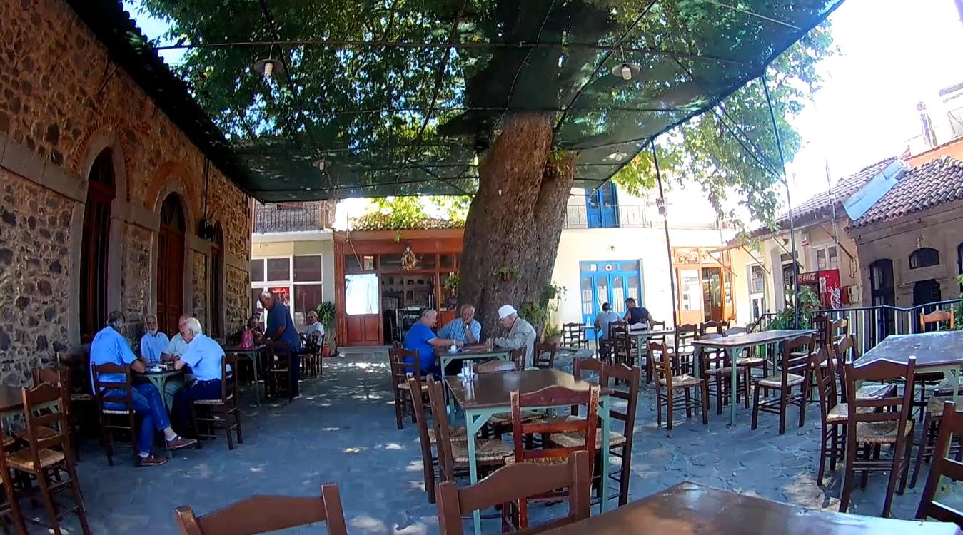 Maar hoe dan ook, Skalochori is leuk voor een stop; even tussen de Griekse mannetjes een drankje en een hapje en