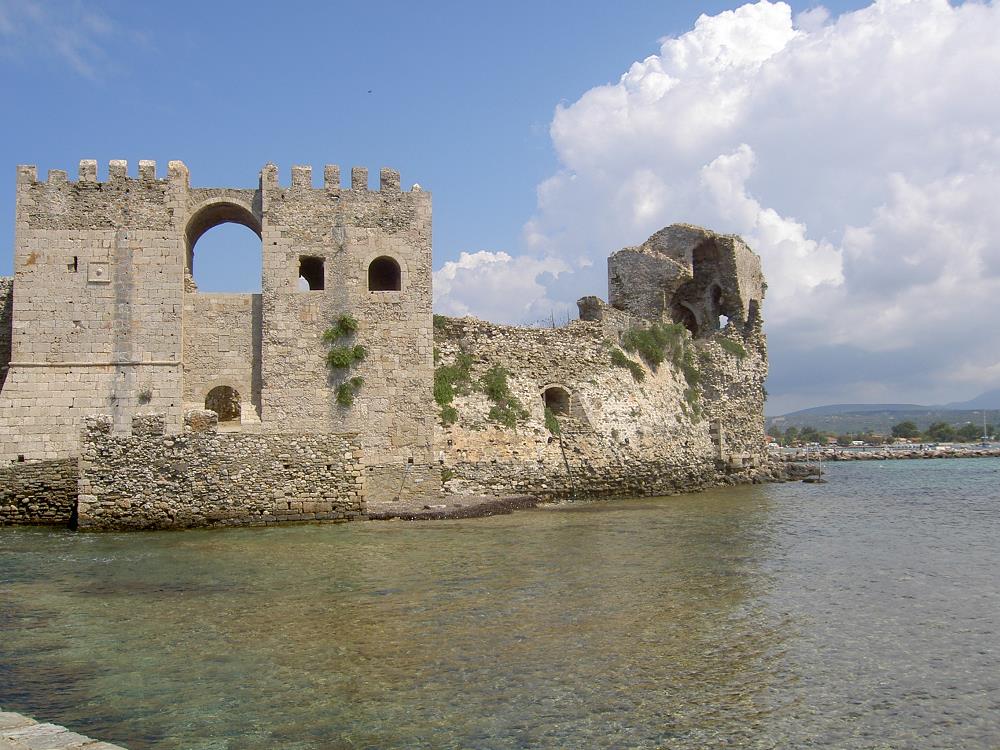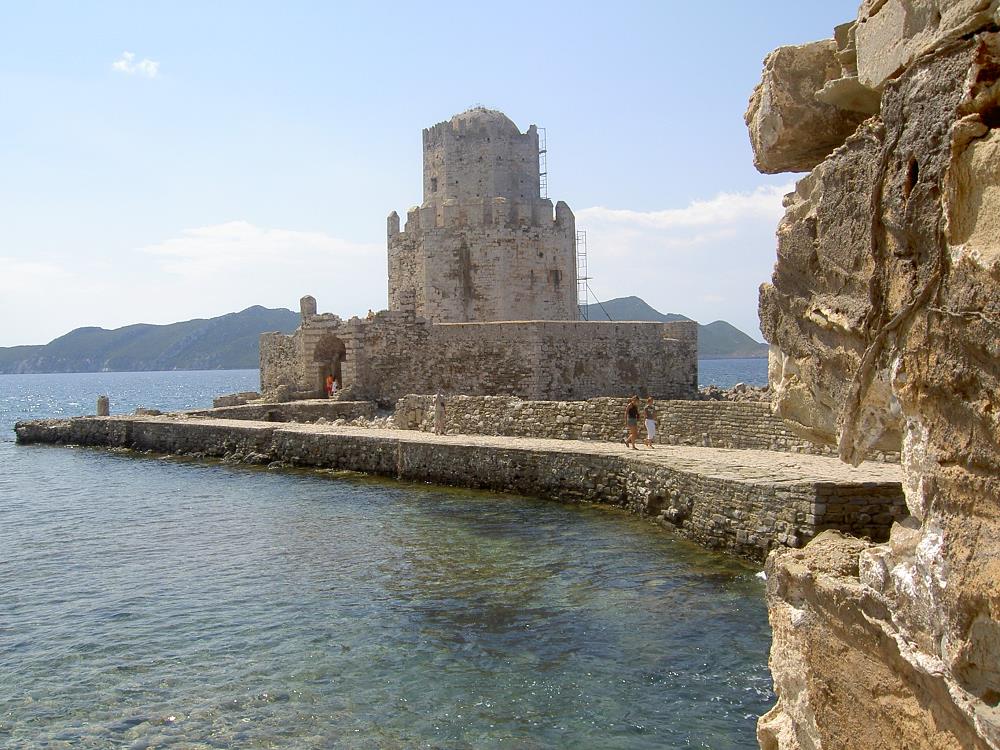 Vanaf het strand kijk je uit op Methoni, aan de overkant van de baai en aan de linkerkant daarvan, het kasteel.