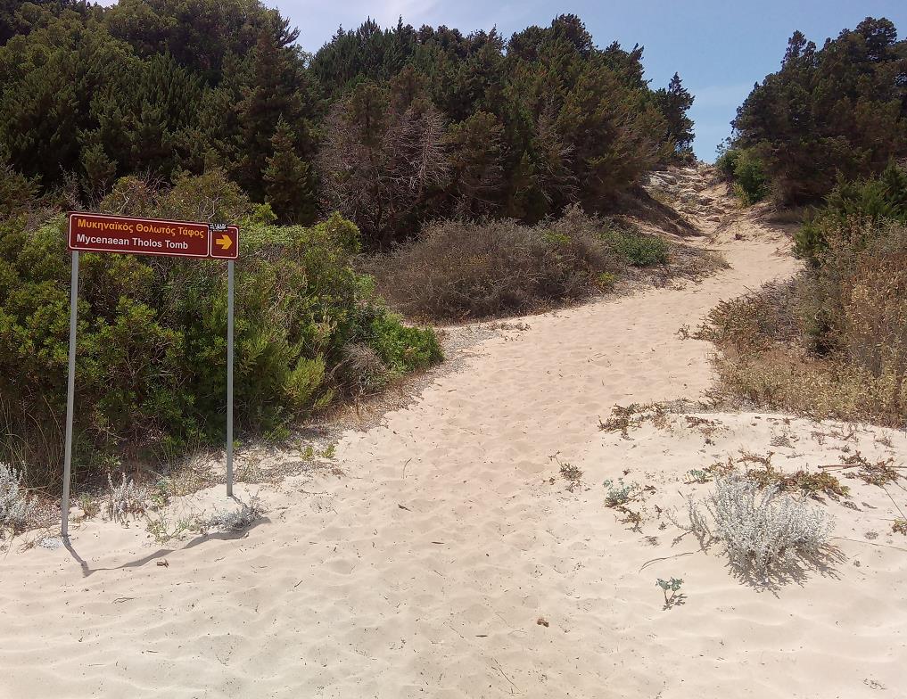 staan geparkeerd. Een eindje daarvoor is er een bordje dat verwijst naar een Myceense tombe. Daar moet je de heuvel op,