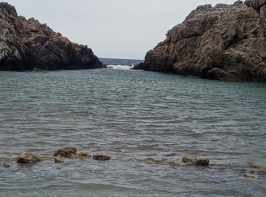 via rotspartijen en boomwortels weer naar beneden. Het strand bestaat uit zand, maar in het water is het rotsachtig.