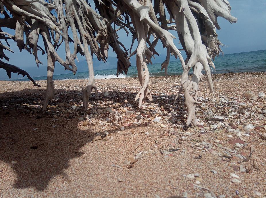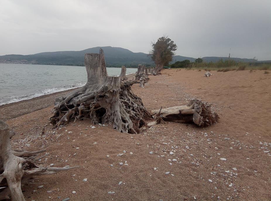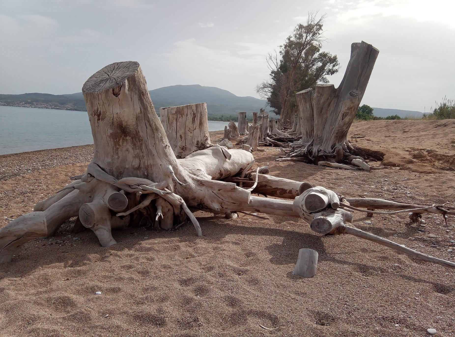 Wat meteen opvalt aan dit strand zijn de omgezaagde bomen. Door de sterke golfslag is in de loop van de tijd het zand, waarin de bomen waren