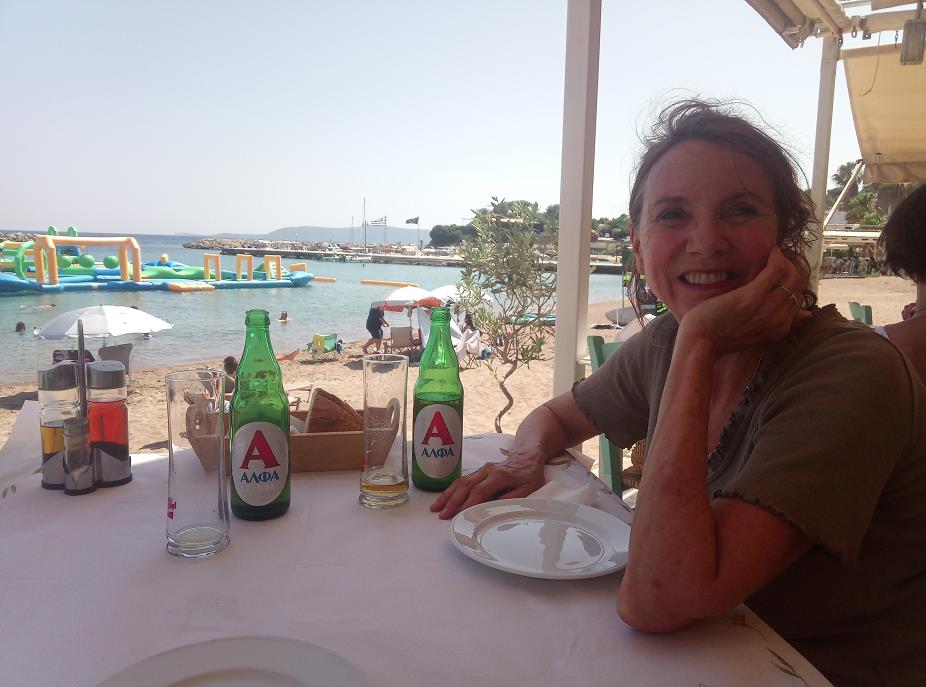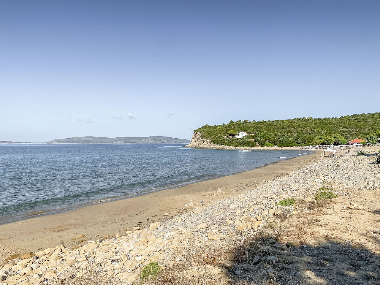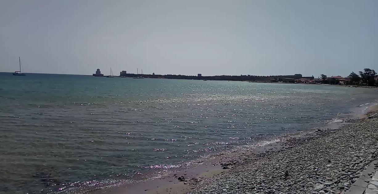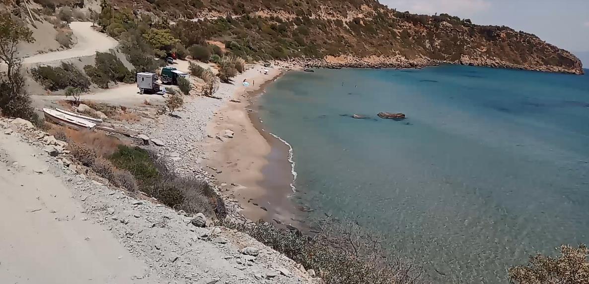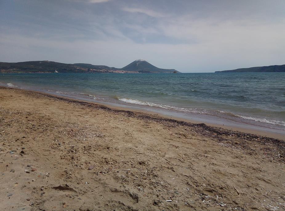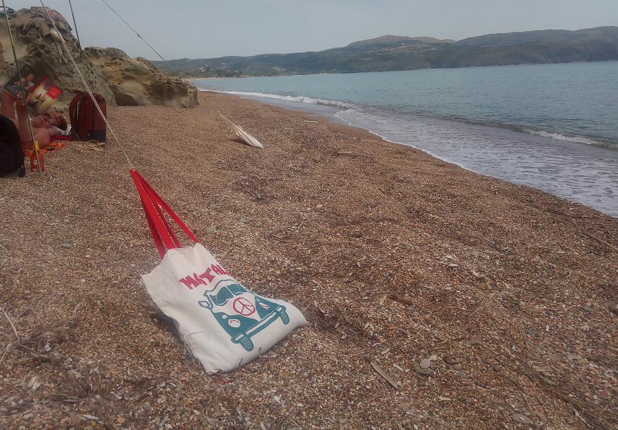 strand van Velikas. Het was nog heet en daarom heerlijk om even te zwemmen. De zee was aardig ruw en er dreef veel wier in het water.