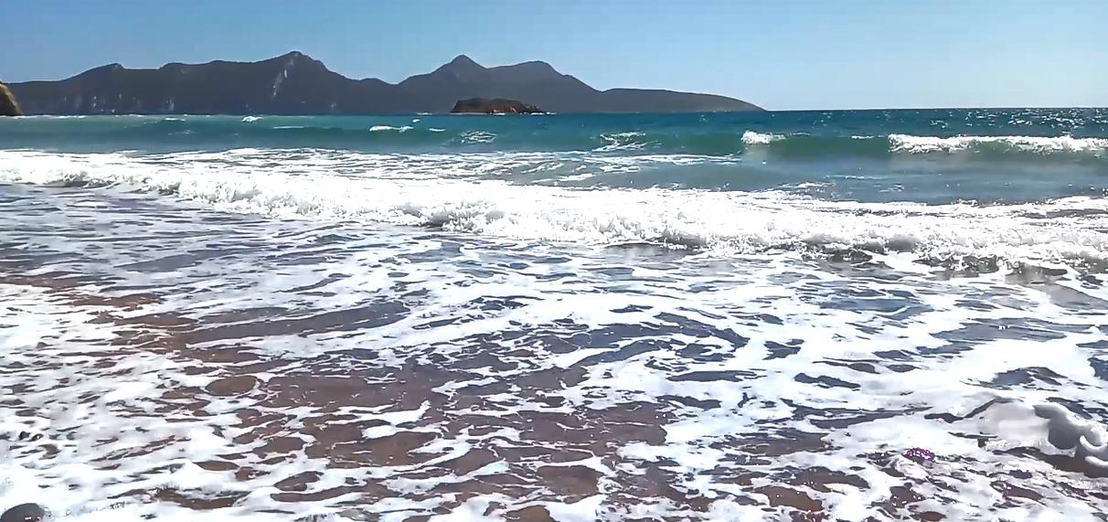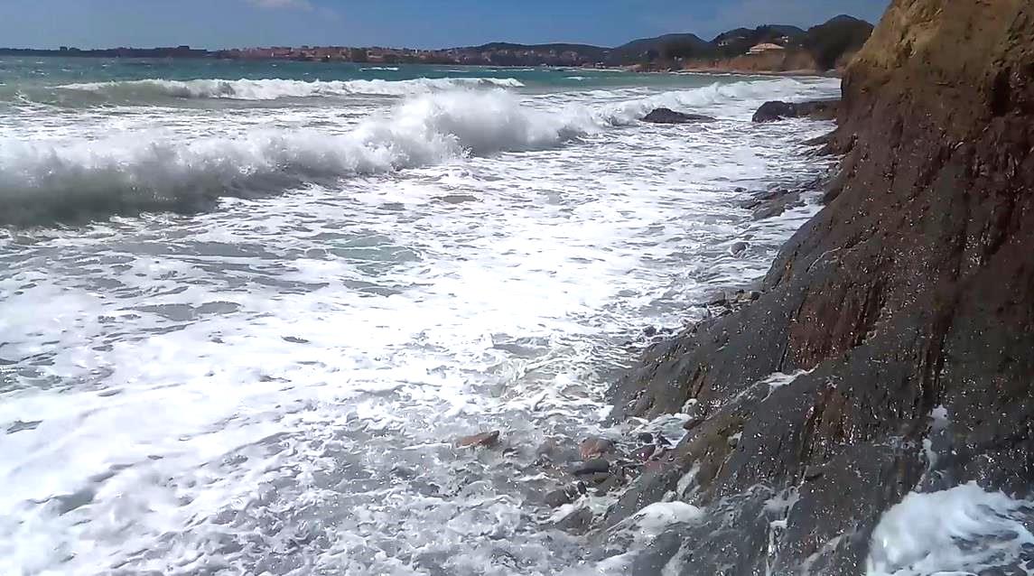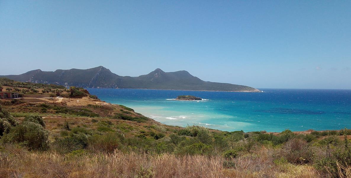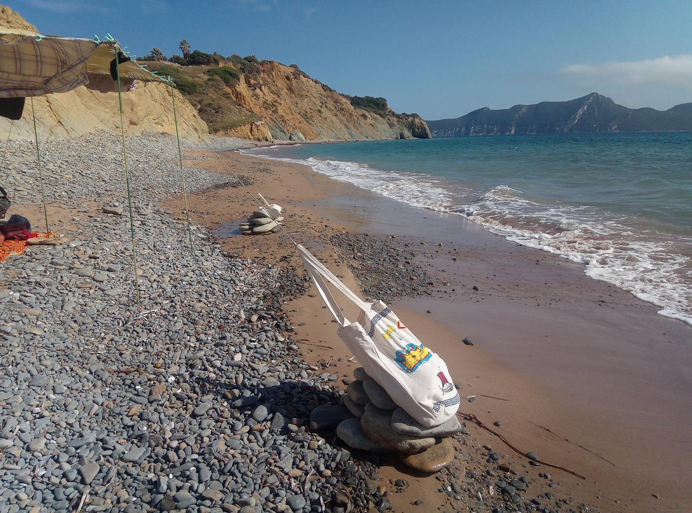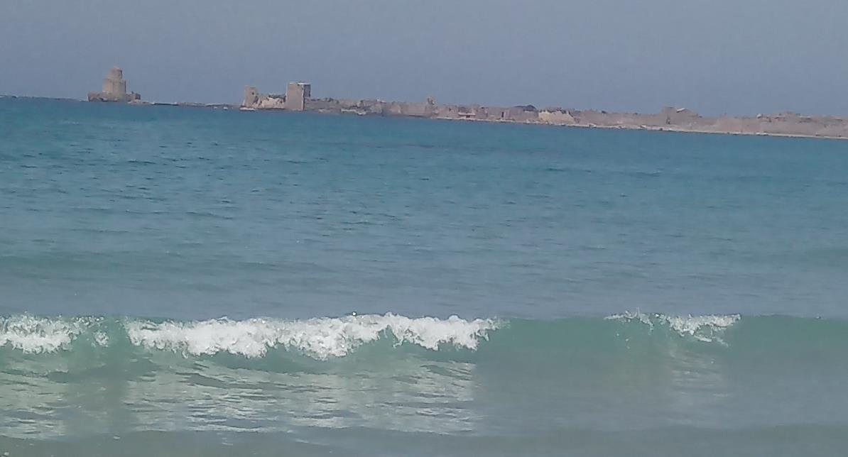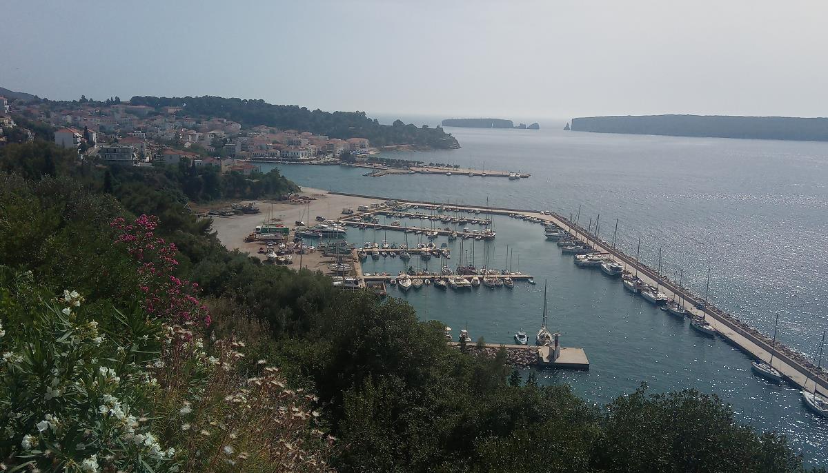 strand van Velikas. Het was nog heet en daarom heerlijk om even te zwemmen. De zee was aardig ruw en er dreef veel wier in het water.