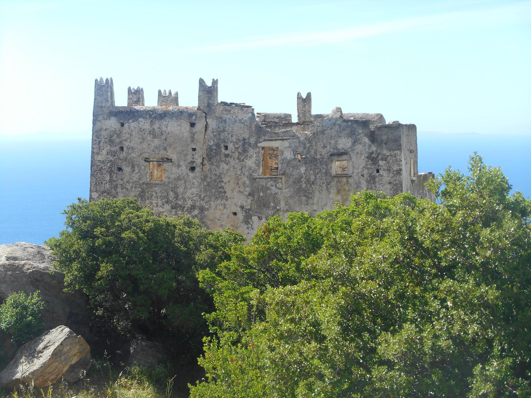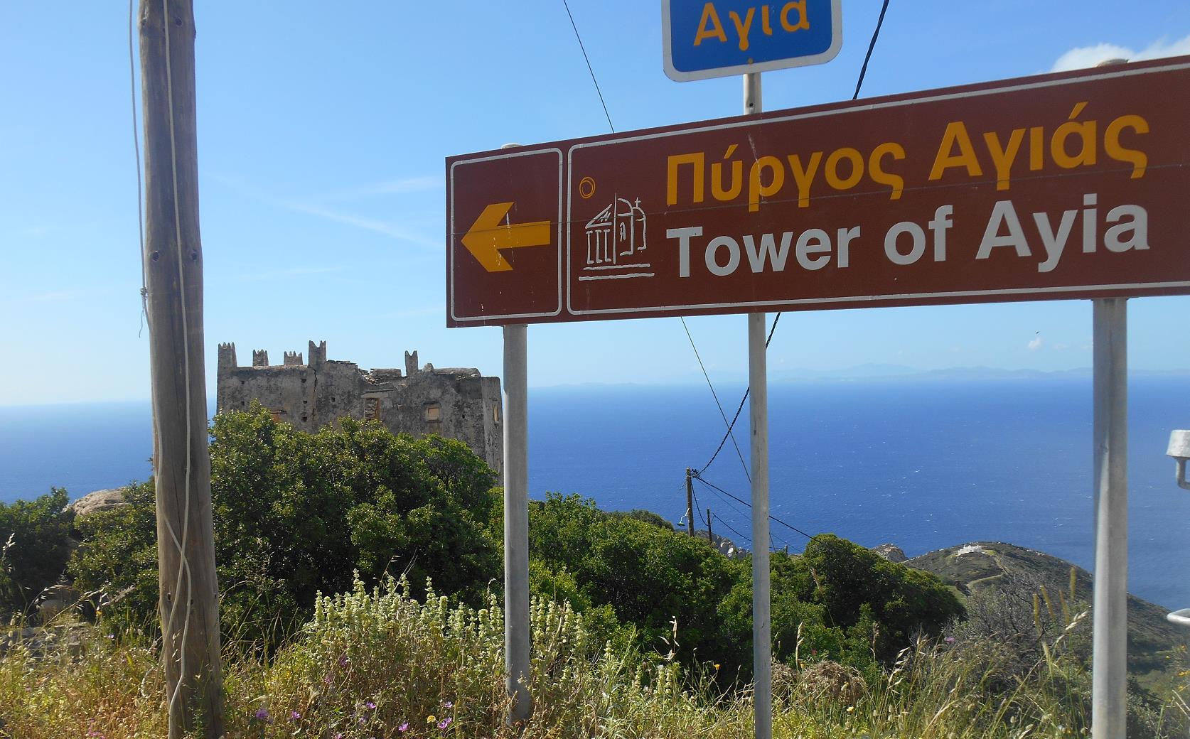 Vanaf het bord kun je via een klein weggetje naar de toren toerijden. Het uitzicht is hier, zoals op veel plekken op Naxos,