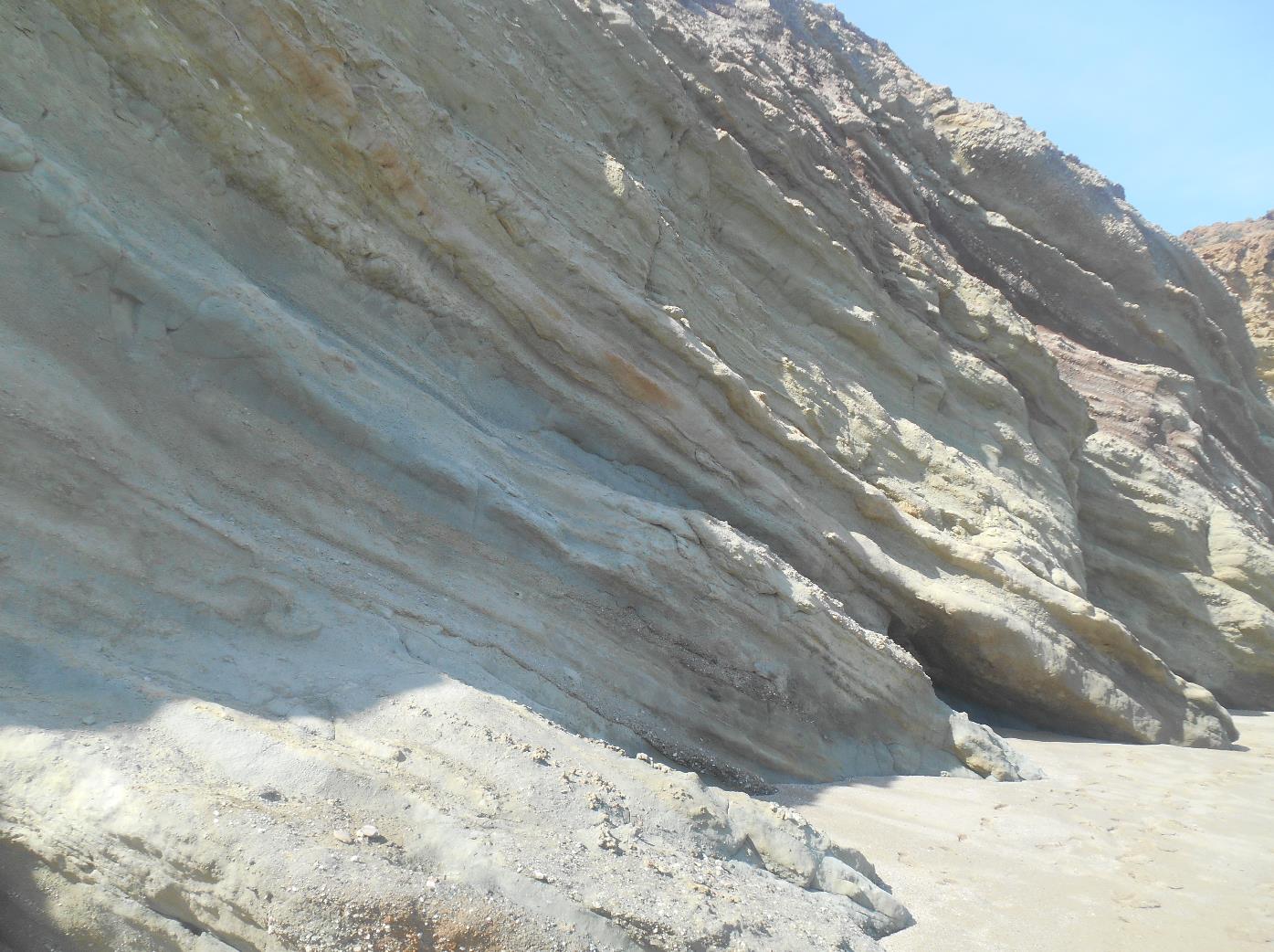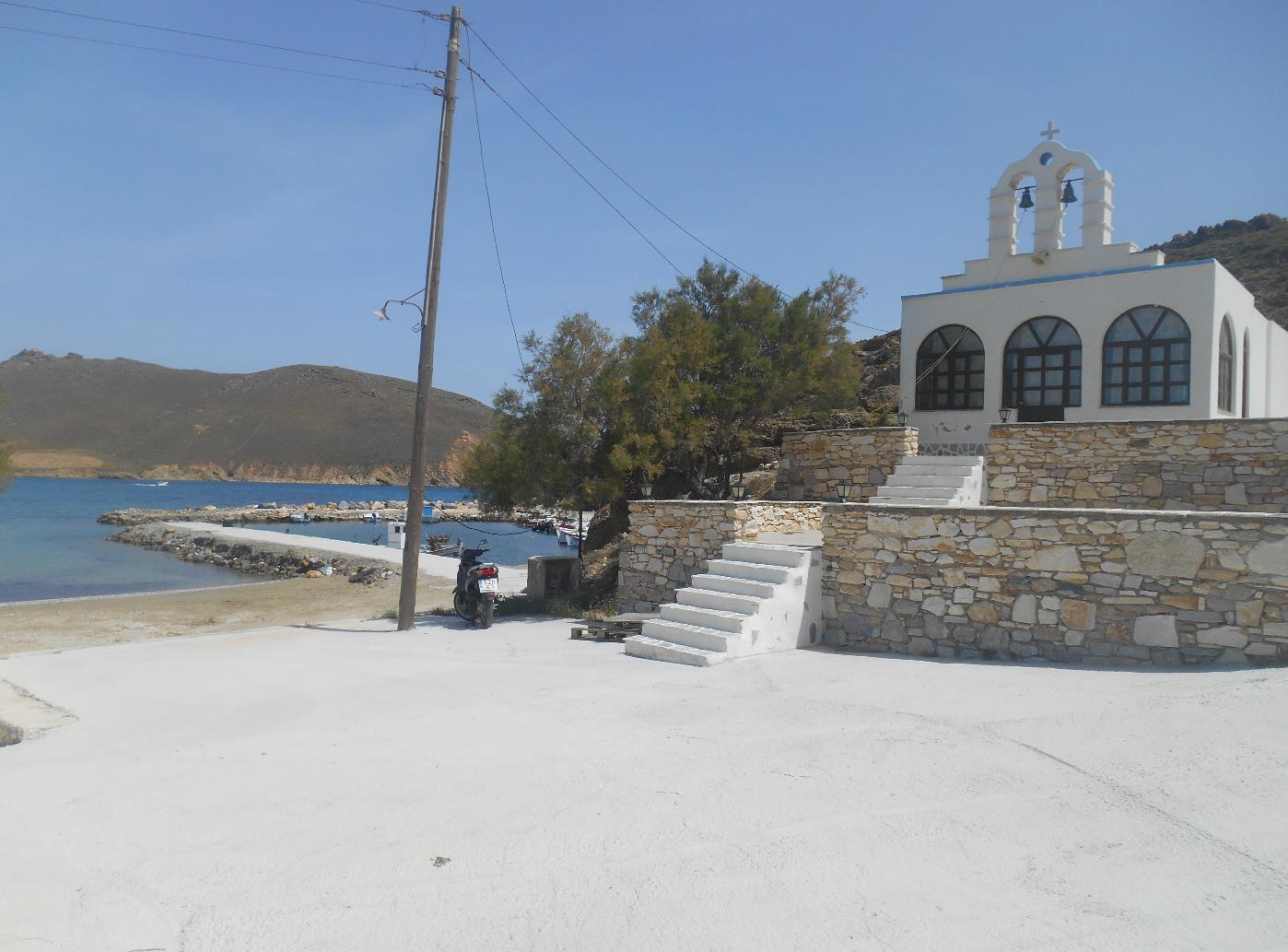 volgt de borden naar Molos. Bij Molos is er een langgerekt strand langs een rondlopende baai. (zie foto linksboven). Het is een mooi zandstrand begrenst met bomen. Aan de zuidkant is er een haventje en een kerkje. (foto rechtsonder). Vlak bij dit kerkje loopt er een pad verder naar het zuiden, net om een lage berg heen, direct naar de zee. Precies daar is het Kalogeras-strand. |