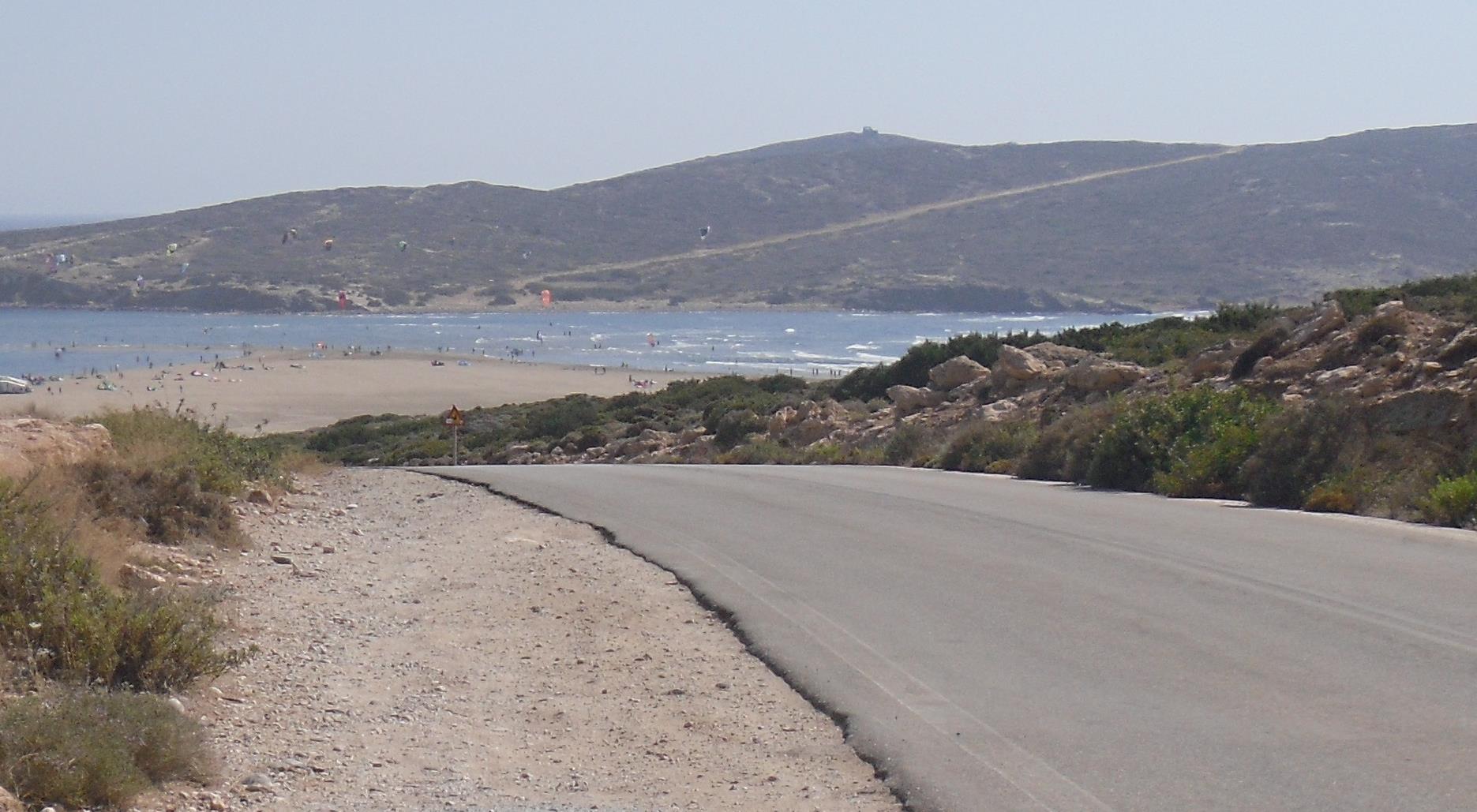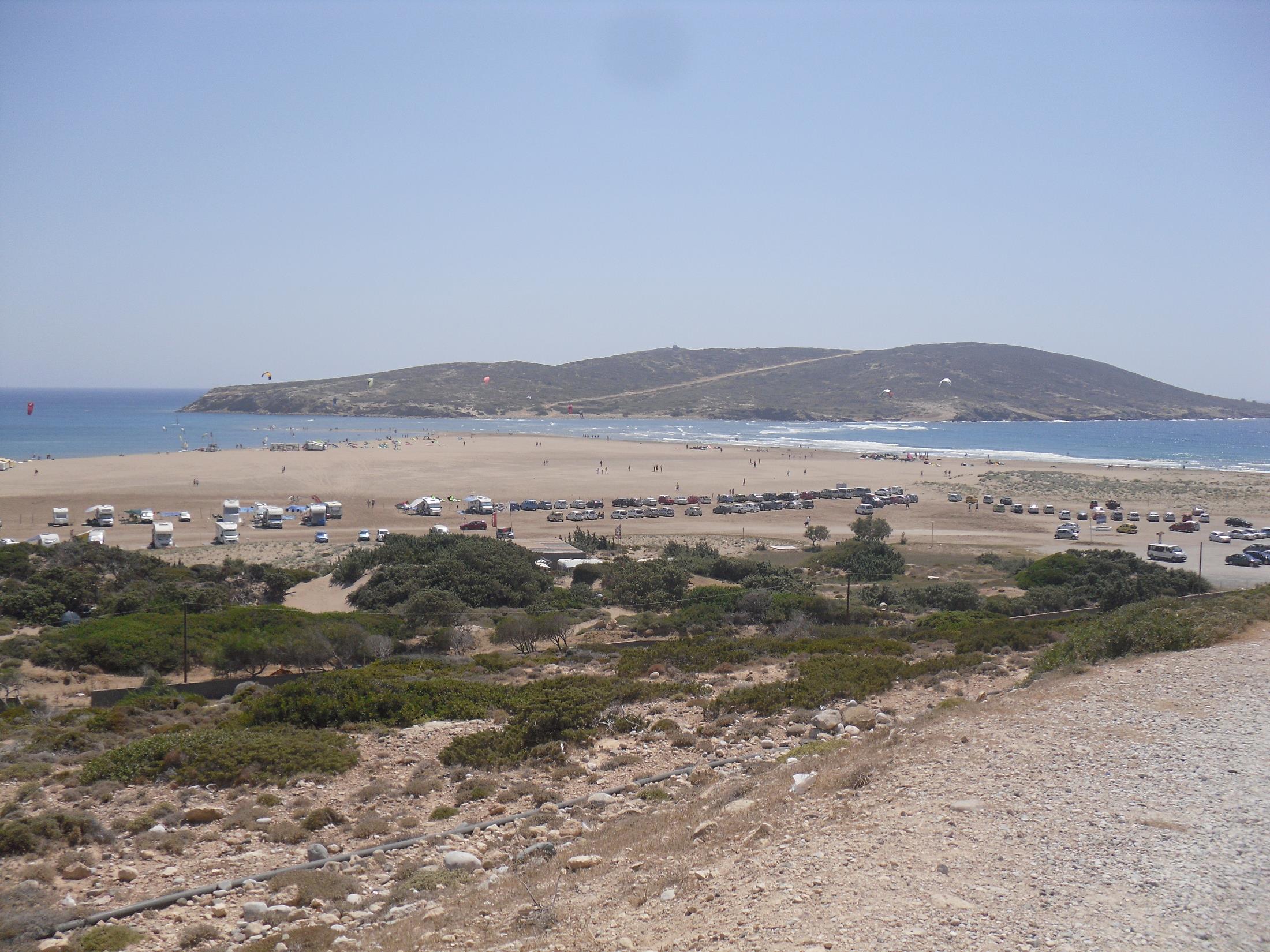 zijn niet veel mensen, maar op de brede zandplaat die Prasonissi met Rodos verbindt is het vaak
