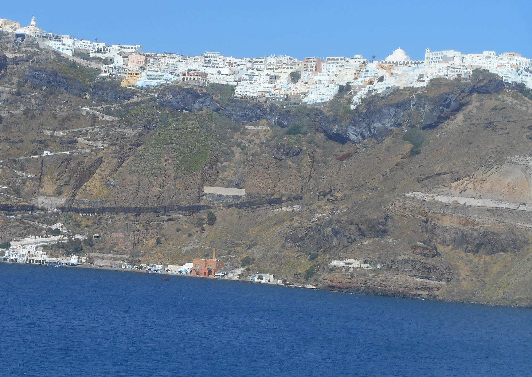 bevindt zich de oude haven van Santorini en iets meer naar het zuiden de haven van Athinios.