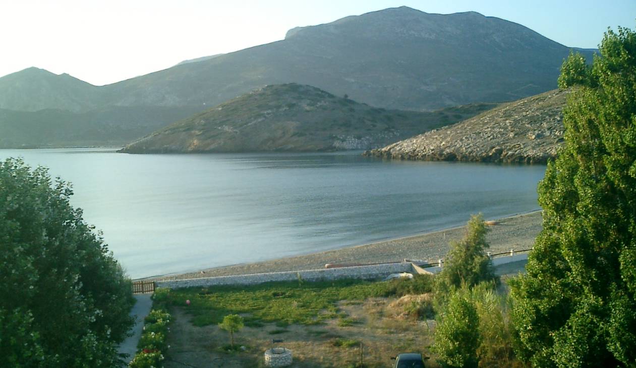 westen van het eiland en op ongeveer 10 kilometer vanaf de haven van het eiland (Linaria).