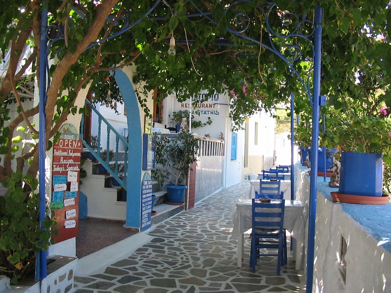 Op de foto links zie je het uitzicht op het eiland, vanaf Kalymnos. Op de foto rechts de boulevard, gezien vanaf de boot.
