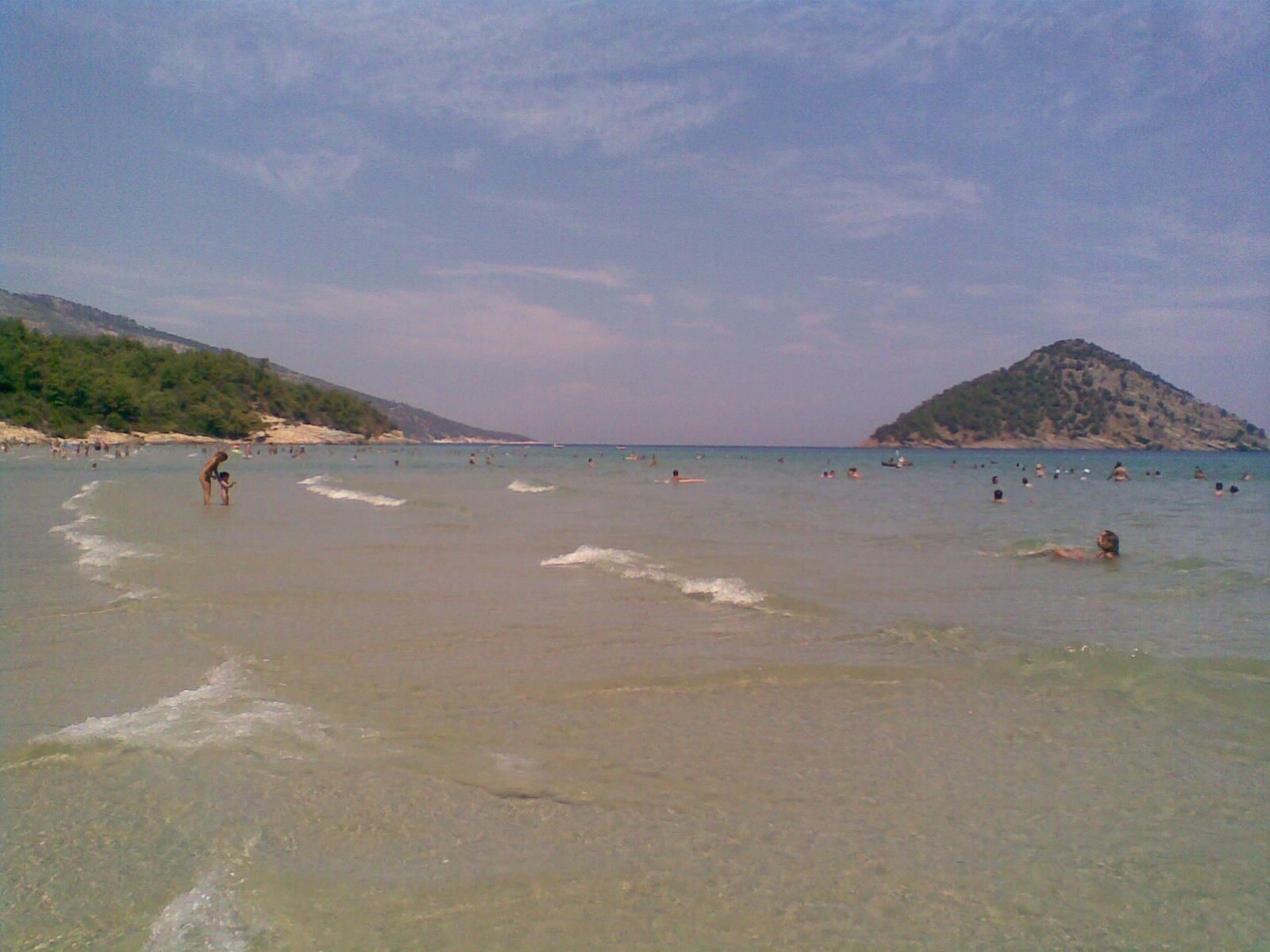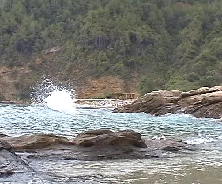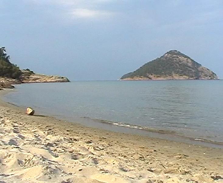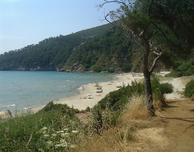 omringd door groene bergen. Het is heel bekend op het eiland. Een deel van het strand is bestemd voor naturisten.