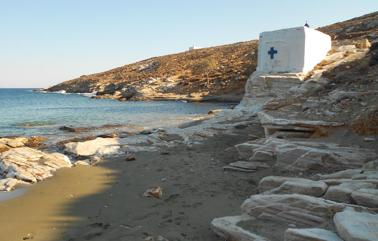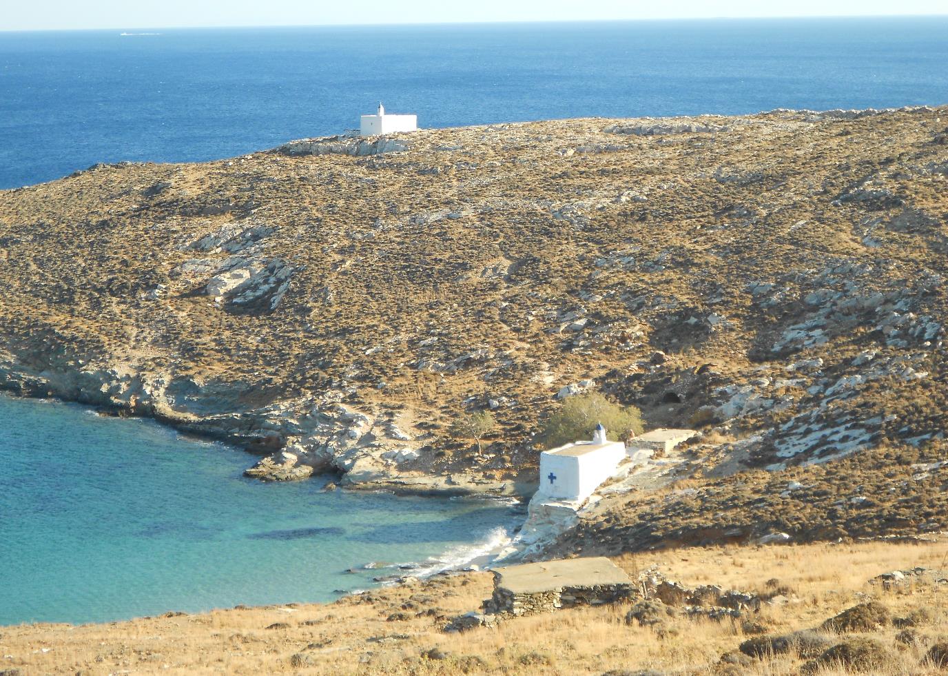 Beneden bij het kleine strandje staat een kerkje en een eindje verderop, op de heuvel,