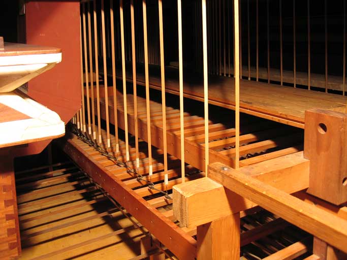 De traktuur van het orgel bestaat uit lange latjes, die de toetsen verbinden met de klepjes die direct onder de
