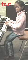 ![]() - De bank moet recht staan, midden achter het keyboard en de leerling moet midden op de bank zitten, niet te ver óp de bank, zodat de bovenbenen vrij van de bank zijn. Beide voeten moeten plat op de grond staan, ongeveer 20-25 cm uit elkaar. Bij jonge kinderen is het aan te raden om een voetenbankje te gebruiken. De ruimte tussen de knieen mag niet groter zijn dan die tussen de voeten; dus niet met O-benen zitten! - De rug moet recht zijn, het bekken zodanig gekanteld, dat ook de onderrug recht is. Een lichte holte in de onderrug is normaal en betekent juist dat de rug goed recht is en in balans ! De leerling moet ontspannen zitten; vooral de schouders en de vingers moeten ontspannen zijn. - Wanneer de leerling in deze houding zit en zijn vingers op de toetsen zet, moeten de onderarmen ongeveer horizontaal zijn. - Om aan een optimale speelhouding te kunnen voldoen is een verstelbare bank of stoel aan te raden, het liefst zonder rugleuning, maar een verstelbare keyboardstandaard is noodzakelijk! - De houding is een zeer belangrijk aandachtspunt. Het is niet overdreven; 95 % van de mensen is geneigd om verkeerd te zitten. Dit is een slechte basis om goed te musiceren en het is vaak ook een oorzaak van rugklachten. |