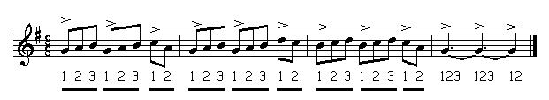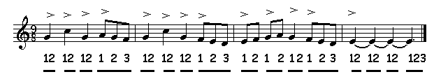 acht-achtsten-maat samengesteld 3-delig: 3 + 3 + 2 onregelmatig |