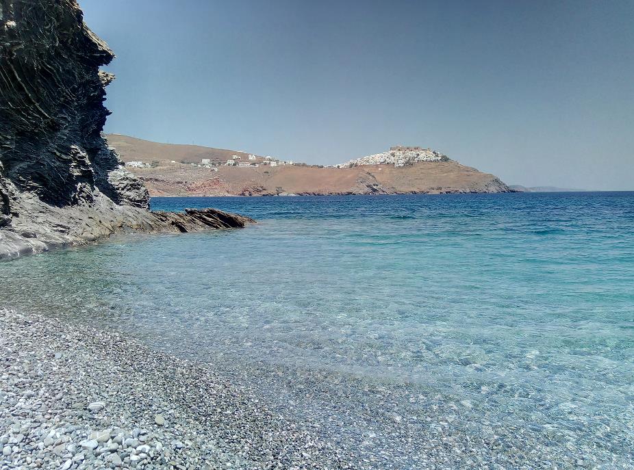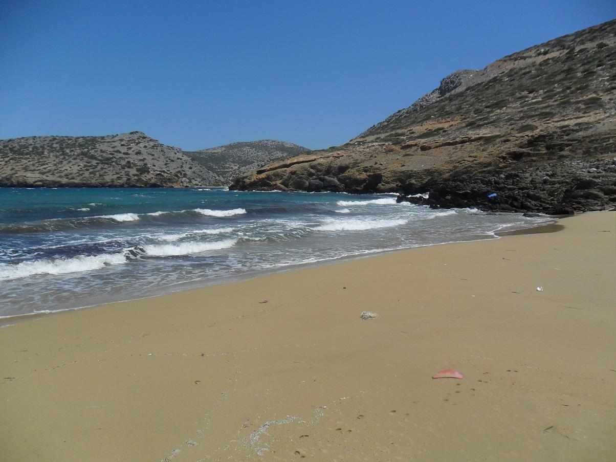 de Cycladen bent. De bodem van het eiland is bruin en grijs van kleur met kleine oases van groen en er zijn mooie baaien met een zandstand.
