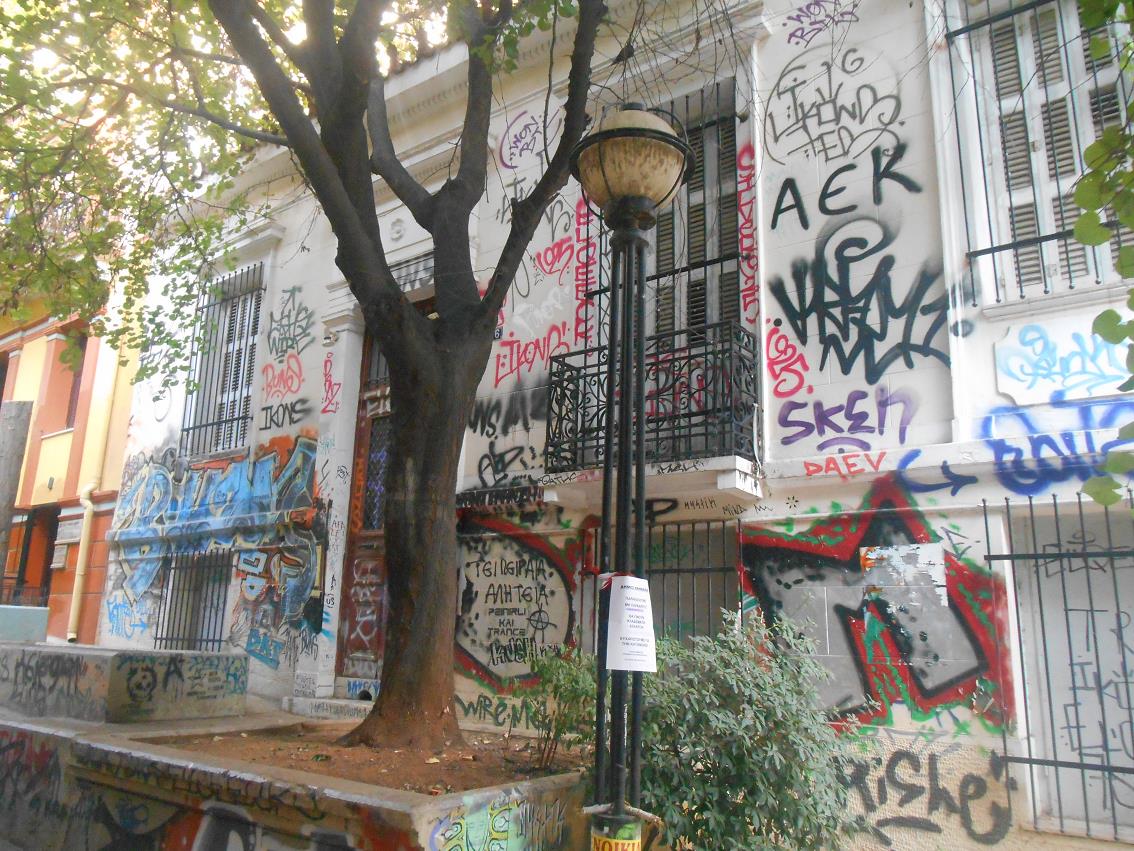een statement leuzen geschilderd. Exarchia wordt in nieuvsberichten wel eens genoemd vanwege protestbijeenkomsten.