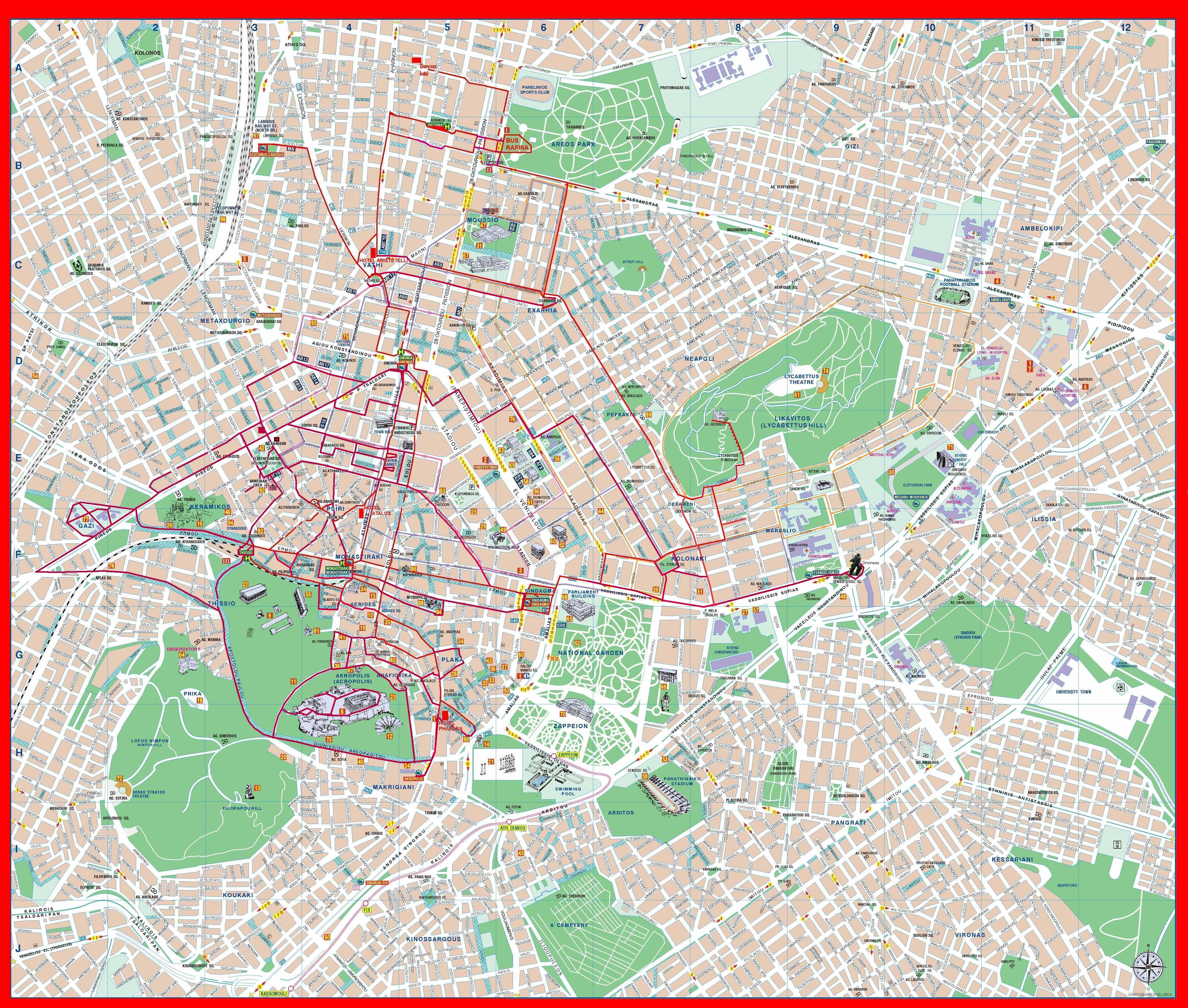 Op deze pagina met kaarten van Athene zie je een klein kaartje van Athene en omgeving en een grote overzichtskaart van de stad met bijbehorende legenda.