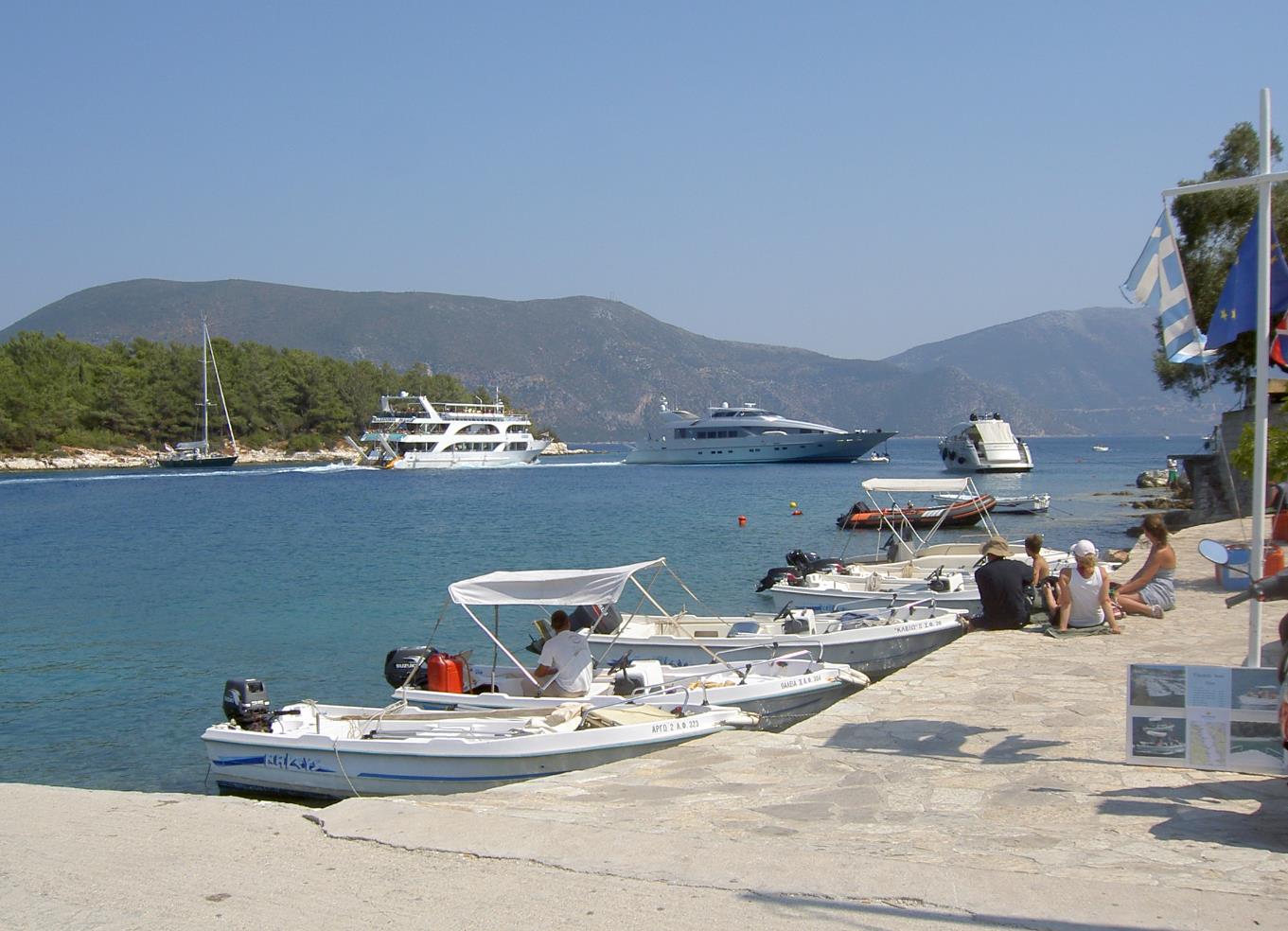 eiland Ithaka. (foto rechts) Onder de bergrug kun je dan weer verder op de hoofdweg naar Sami of Argostoli.