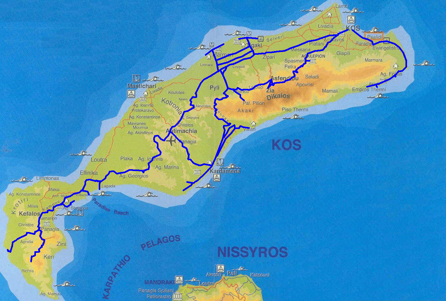 Het westelijk en noordelijk gedeelte van Kos is vrij vlak en rijdt behoorlijk snel. In het zuid-oostelijke deel, daar waar het Dikaiosgebergte ligt,