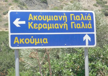 Op de daarna volgende T-splitsing sla je dan linksaf naar Akoumiani Gialia en Keramiani Gialia. (zie de foto van het bordje)