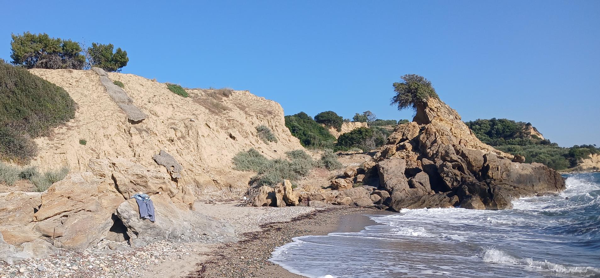 Een klein stukje ten zuiden van Kokkinia ligt echter ook een strand, klein en intiem. Het is gemakkelijk te herkennen wanneer je door het gebied met de prachtig gevormde rotsen rijdt.