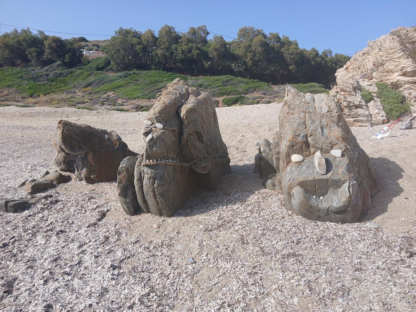 Omdat het strandje hier ook geen naam heeft, zoals zoveel kleine strandjes, bedachten we zelf de naam; het strand van de drie monsters. Er staan vlak bij het