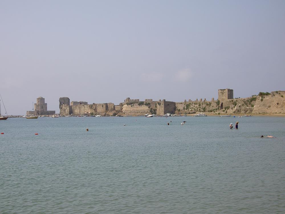 Vanaf het strand kijk je uit op Methoni, aan de overkant van de baai en aan de linkerkant daarvan, het kasteel.