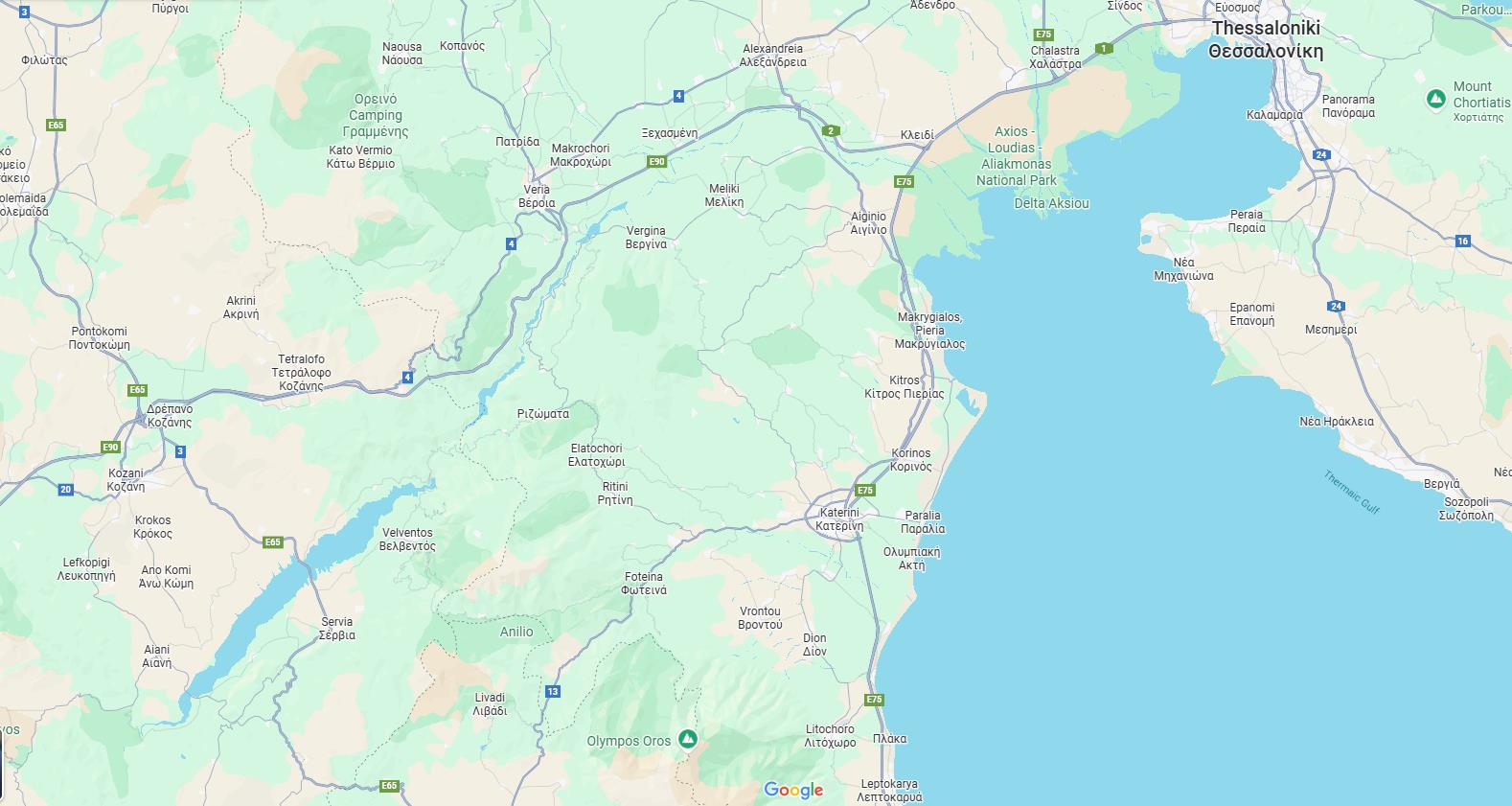 Op het kaartje kun je Katerini zien liggen. Ten oosten van de stad zijn er meerdere mooie stranden. Een eindje ten noorden
