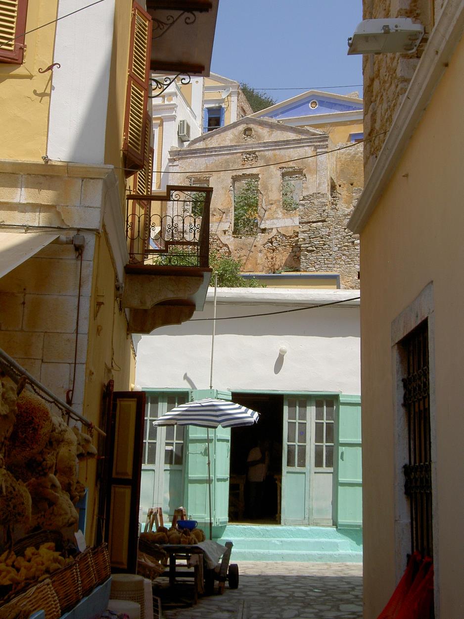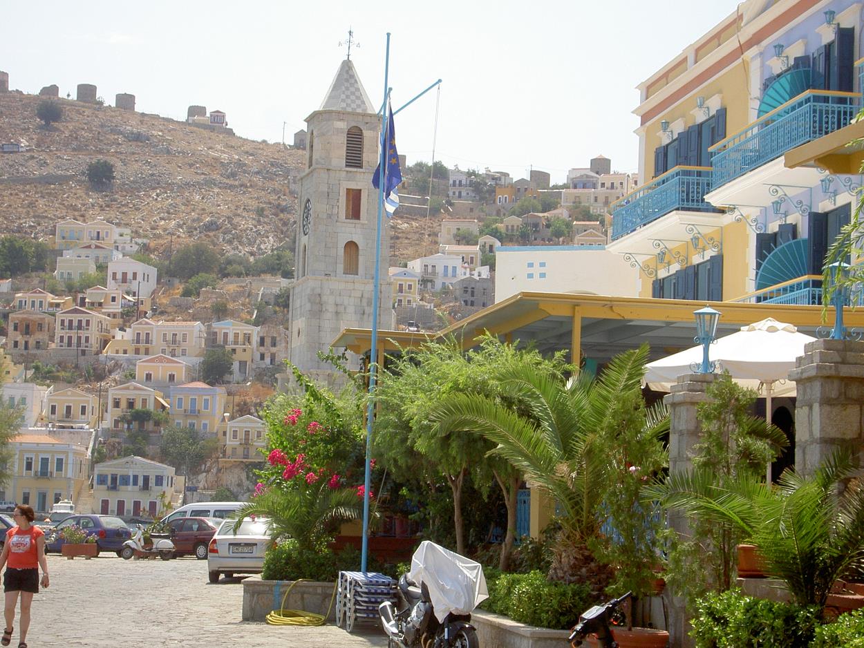 Symi-stad ligt aan de noordkant van het eiland, aan een natuurlijke haven, die een flink eind het binnenland inloopt.