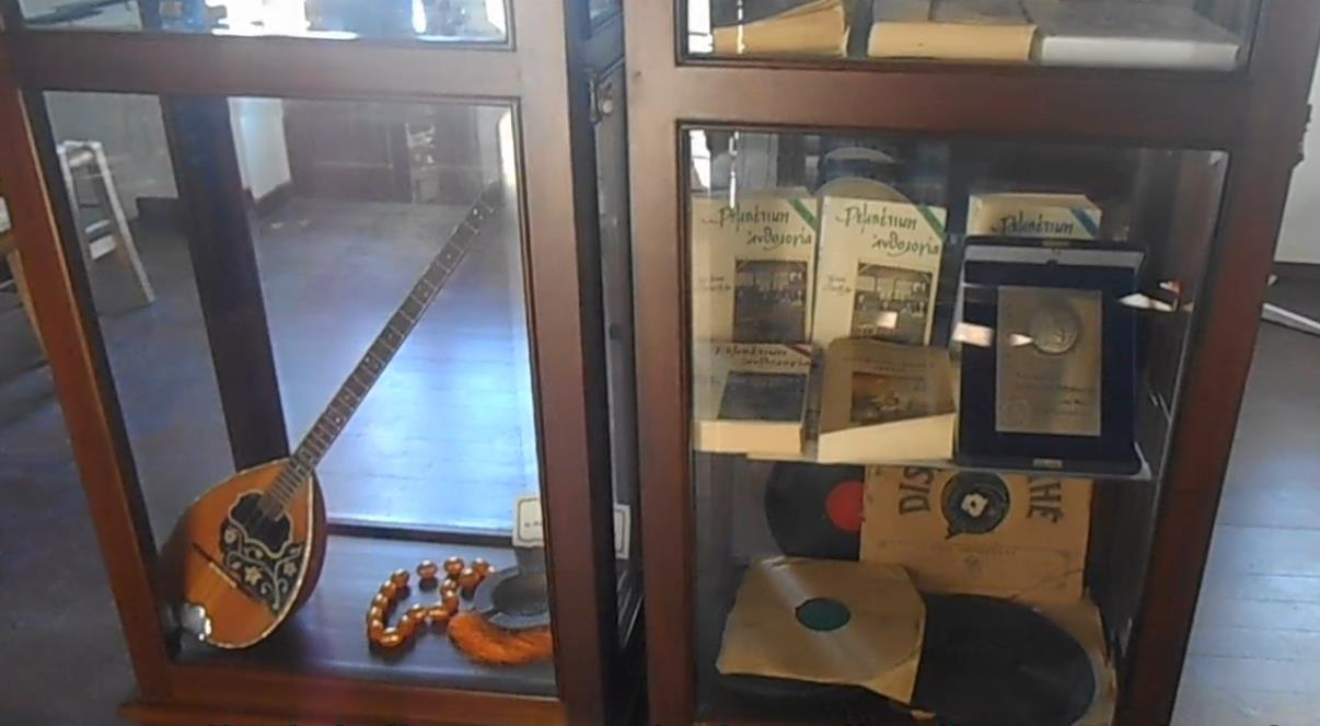 persoonlijke bezittingen van Vamvakaris te zien zijn, zoals een platenspeler, een komboloi en een bouzouki.