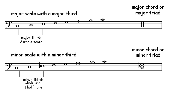 In the example you see the major- and minor scale. The interval between the 1st and 3rd tone of the major scale is a major third. The third of the minor scale is a minor third.