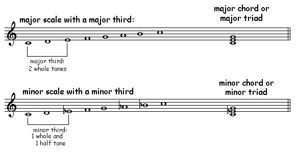 In the example you see the major- and minor scale. The interval between the 1st and 3rd tone