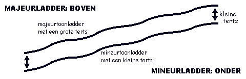 De majeurtoonladder, C-groot, ligt boven en de mineurtoonladder, A-klein, ligt onder.