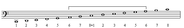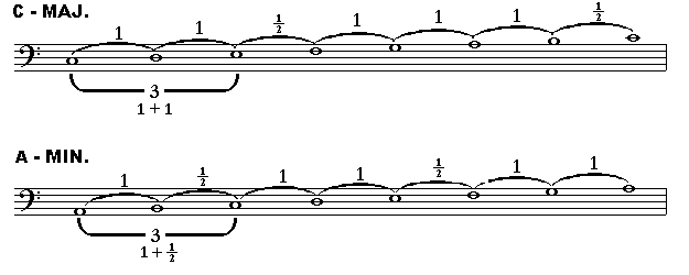 On this page we explane how we derive the minor scale from the major scale. First we write down the major scale.